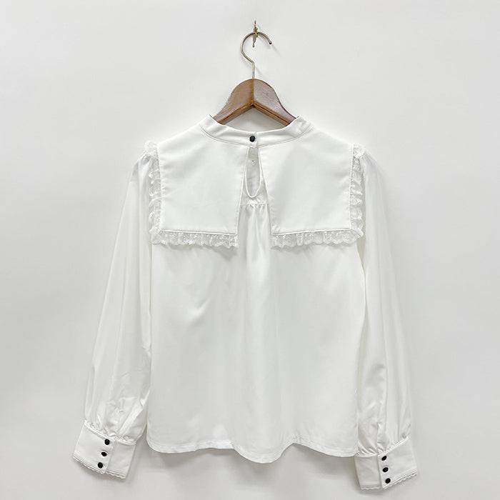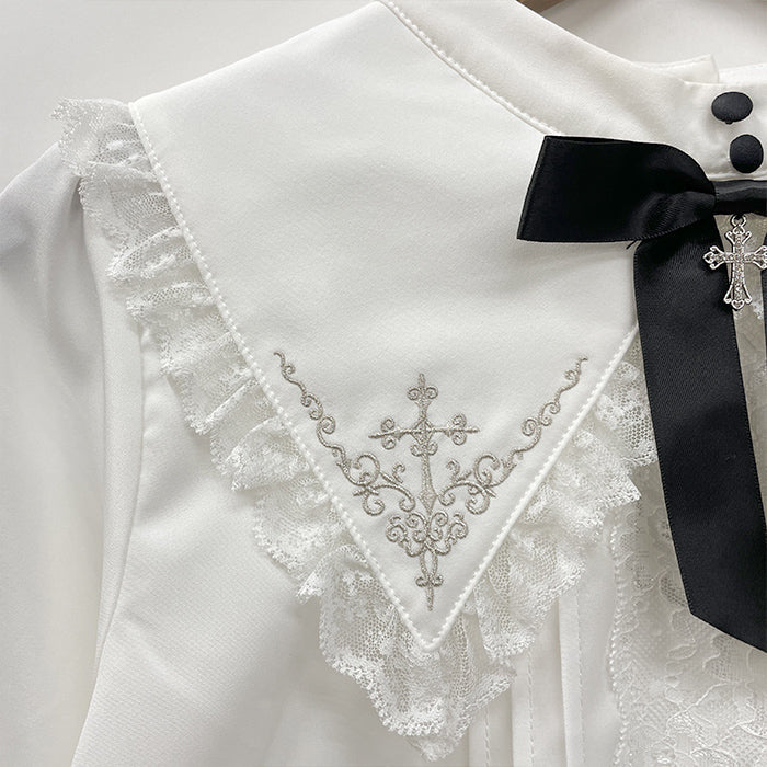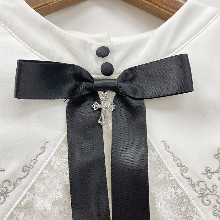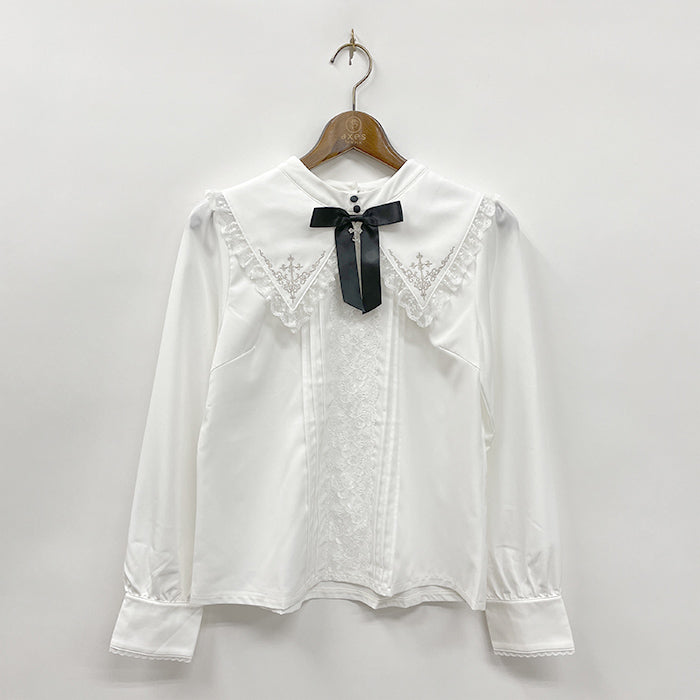 襟にクロスモチーフの刺繍をあしらったブラウスです。