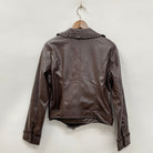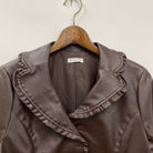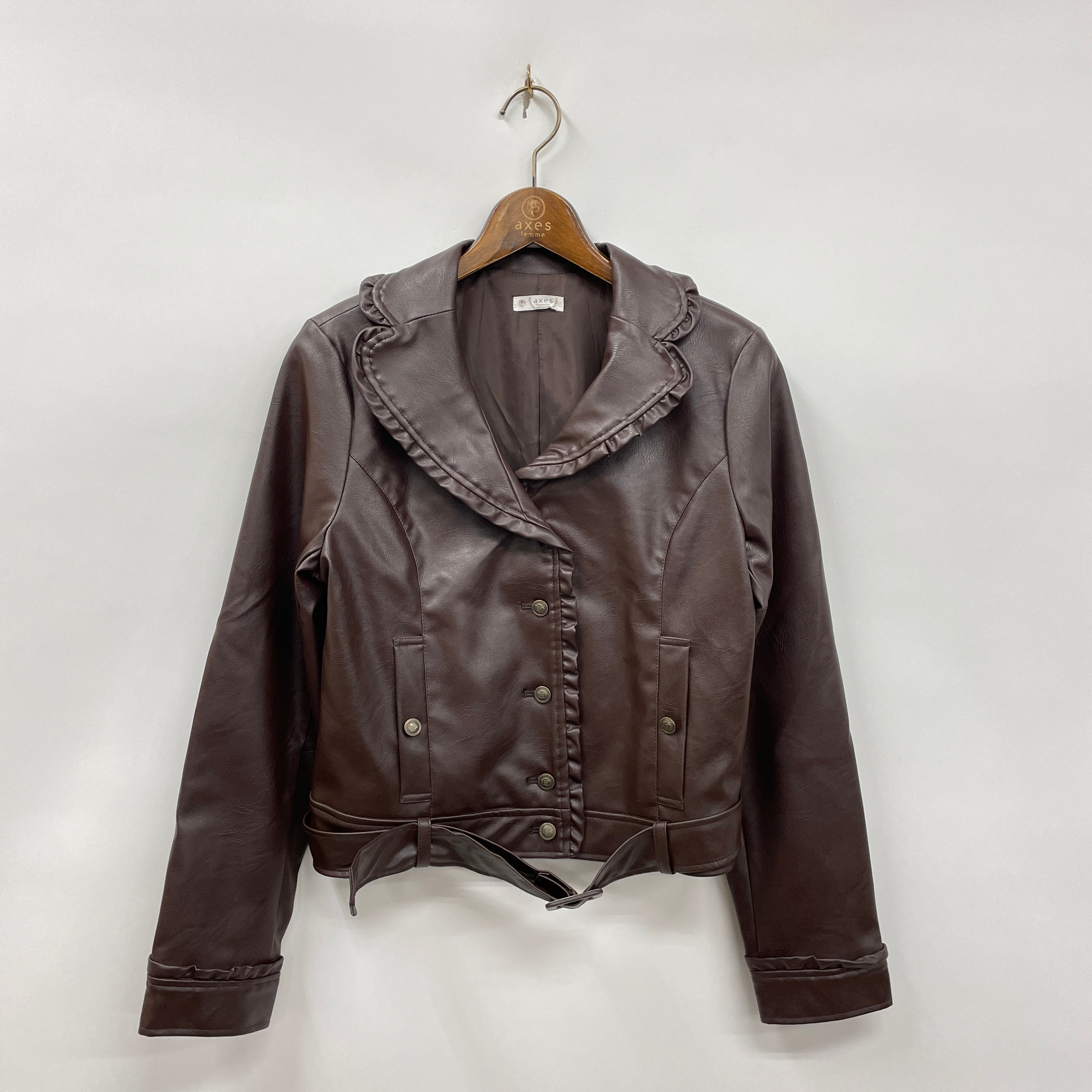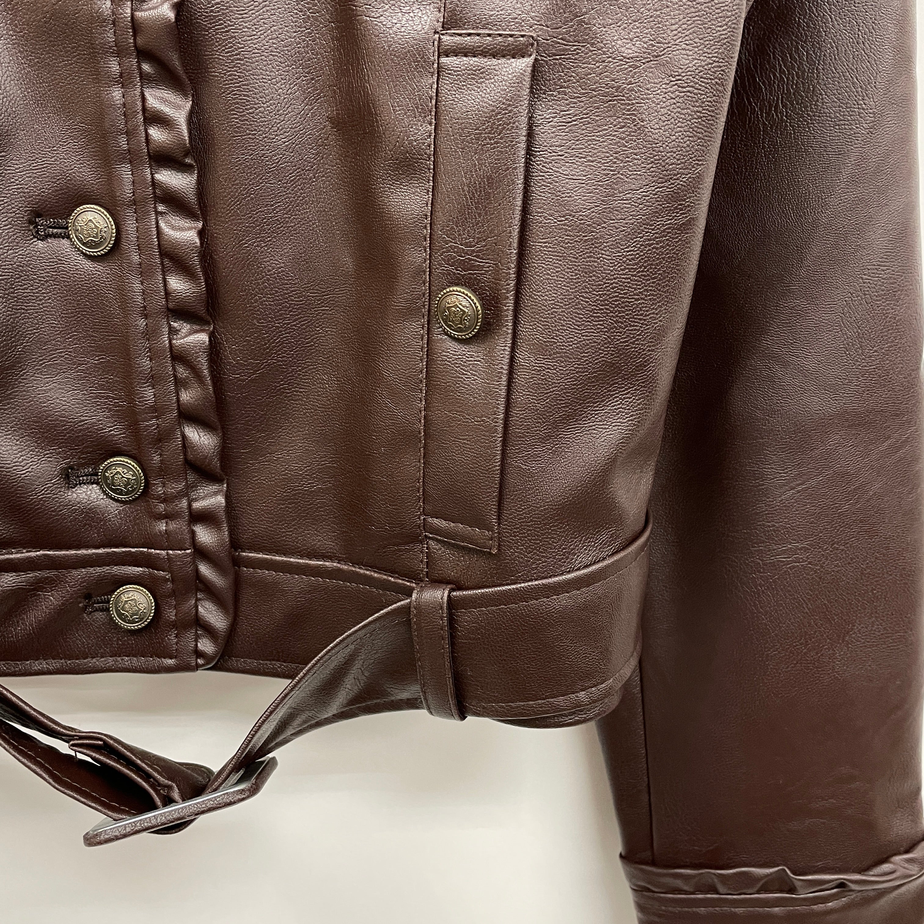 フリル使いが上品な印象のベルト付きブルゾンです。 やわらかいソフト合皮を使用しており、硬すぎず着やすいアイテム、風を通しにくいため保温性も◎。襟部分の角はややラウンドになっており、やわらかい印象に。ボタンつかいがaxesfemmeらしいポイント。 裏地付でごわつかず着心地良く、ポケット付で利便性も◎。パンツスタイルでクールに、ワンピース・スカートでエレガンスにも着用できる汎用性の高いアイテムです。
