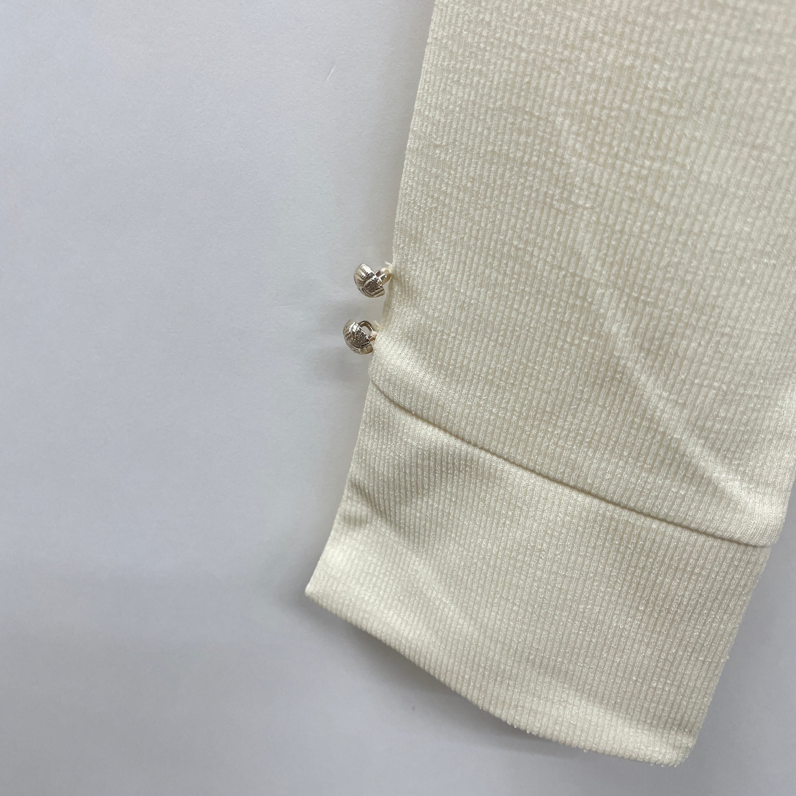 リブなので上半身をすっきりと見せ、フレアやワイドのシルエットのボトムとのバランスが取りやすい1着です。