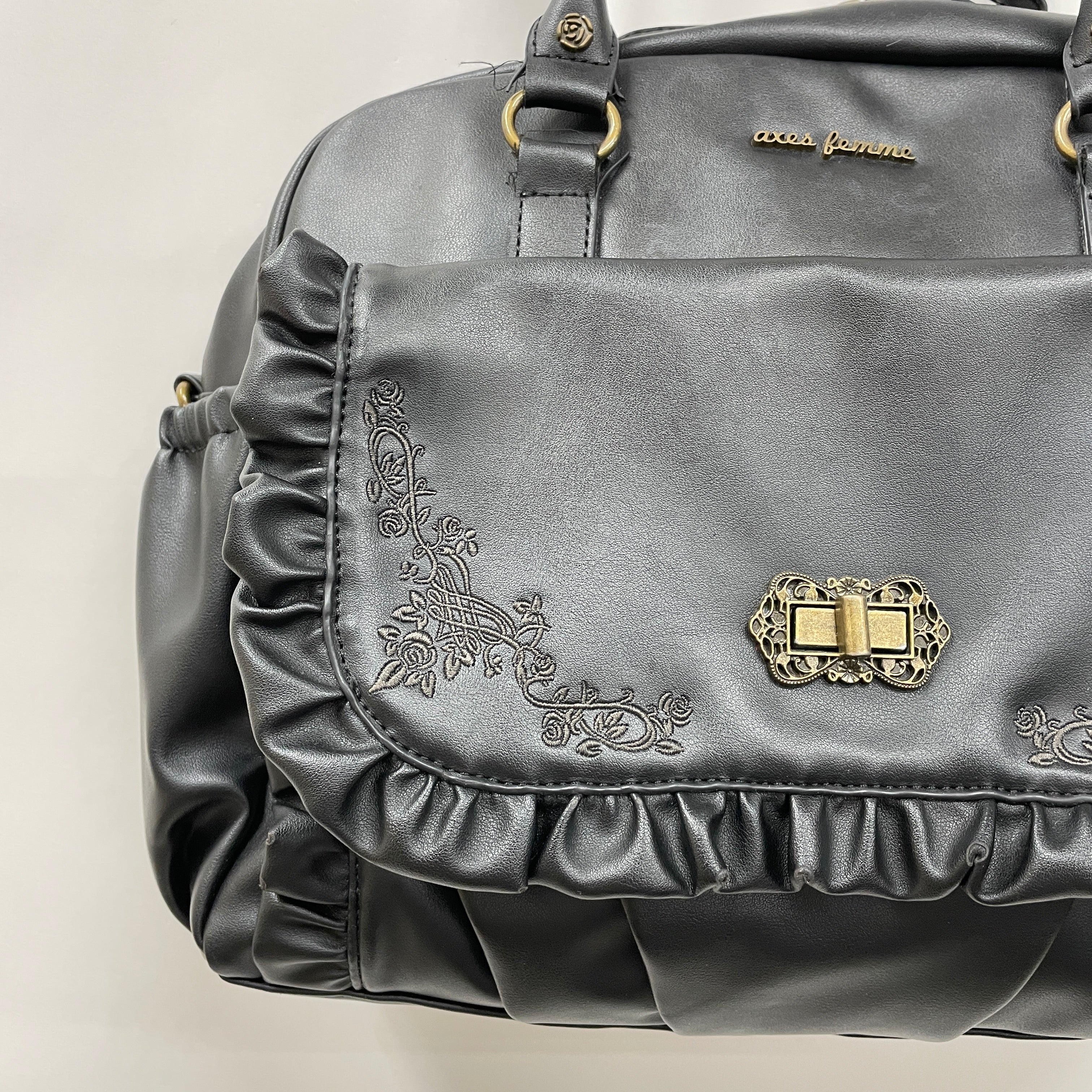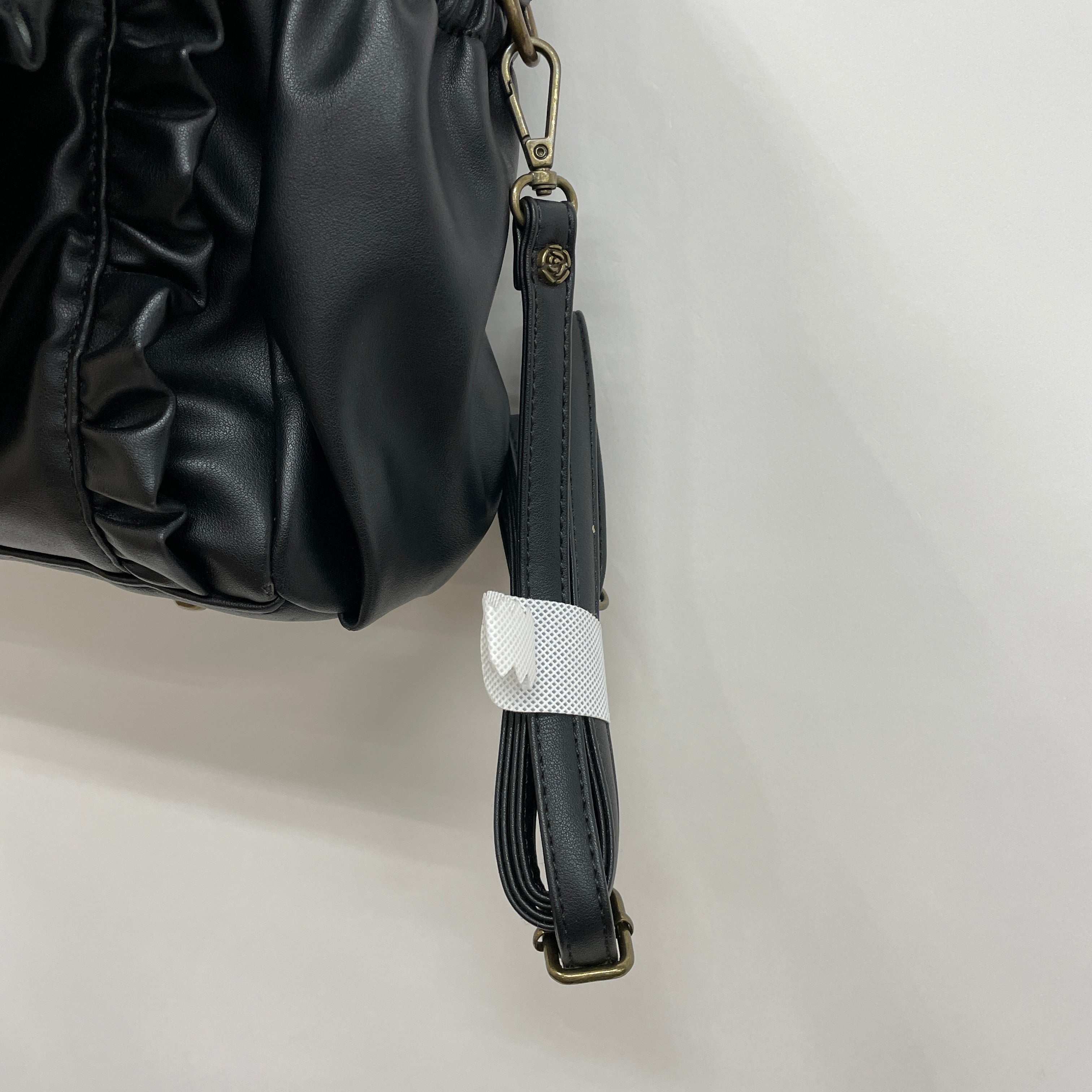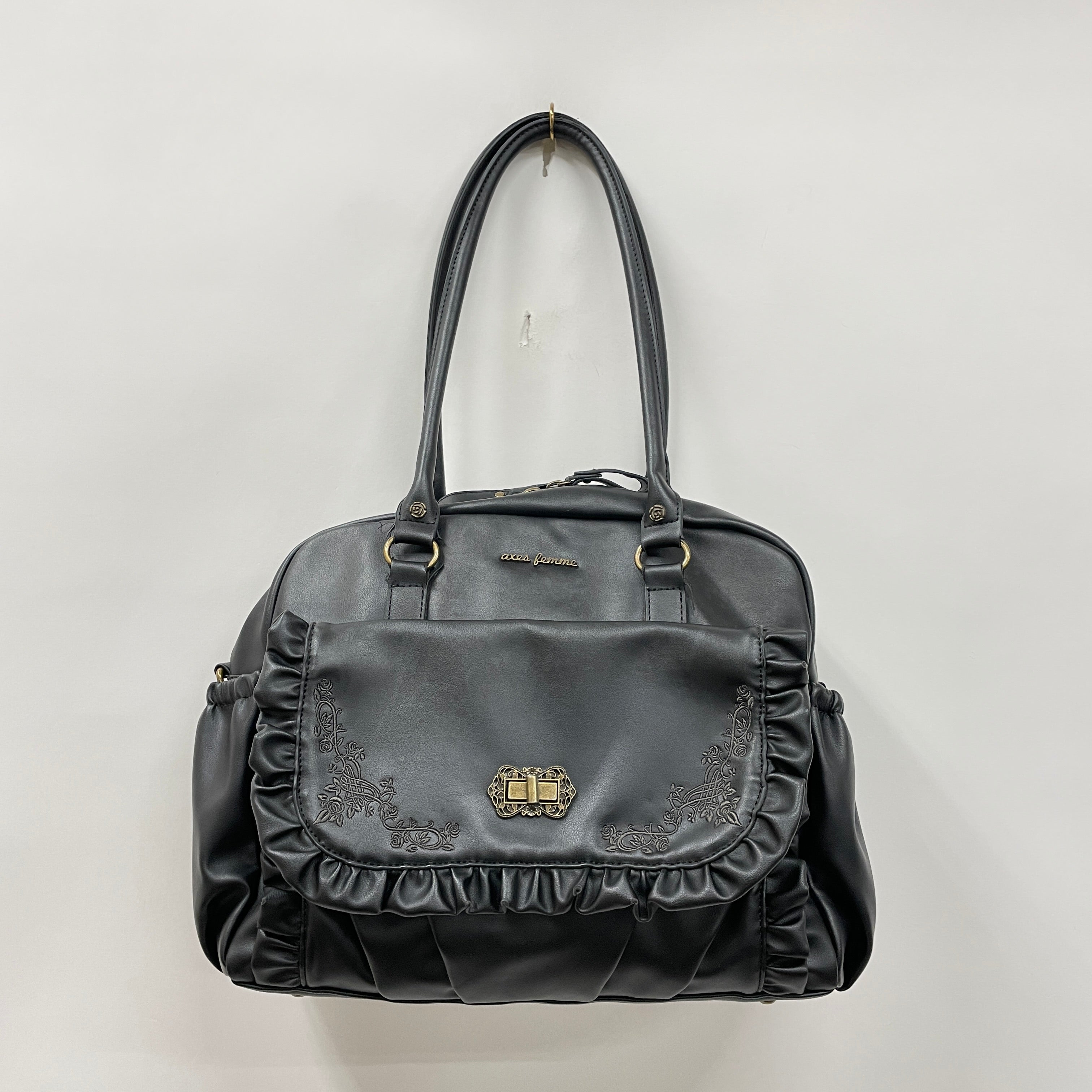 薔薇モチーフのスタッズや繊細な金具使いなど、さりげないフェミニンなディティールにも注目。