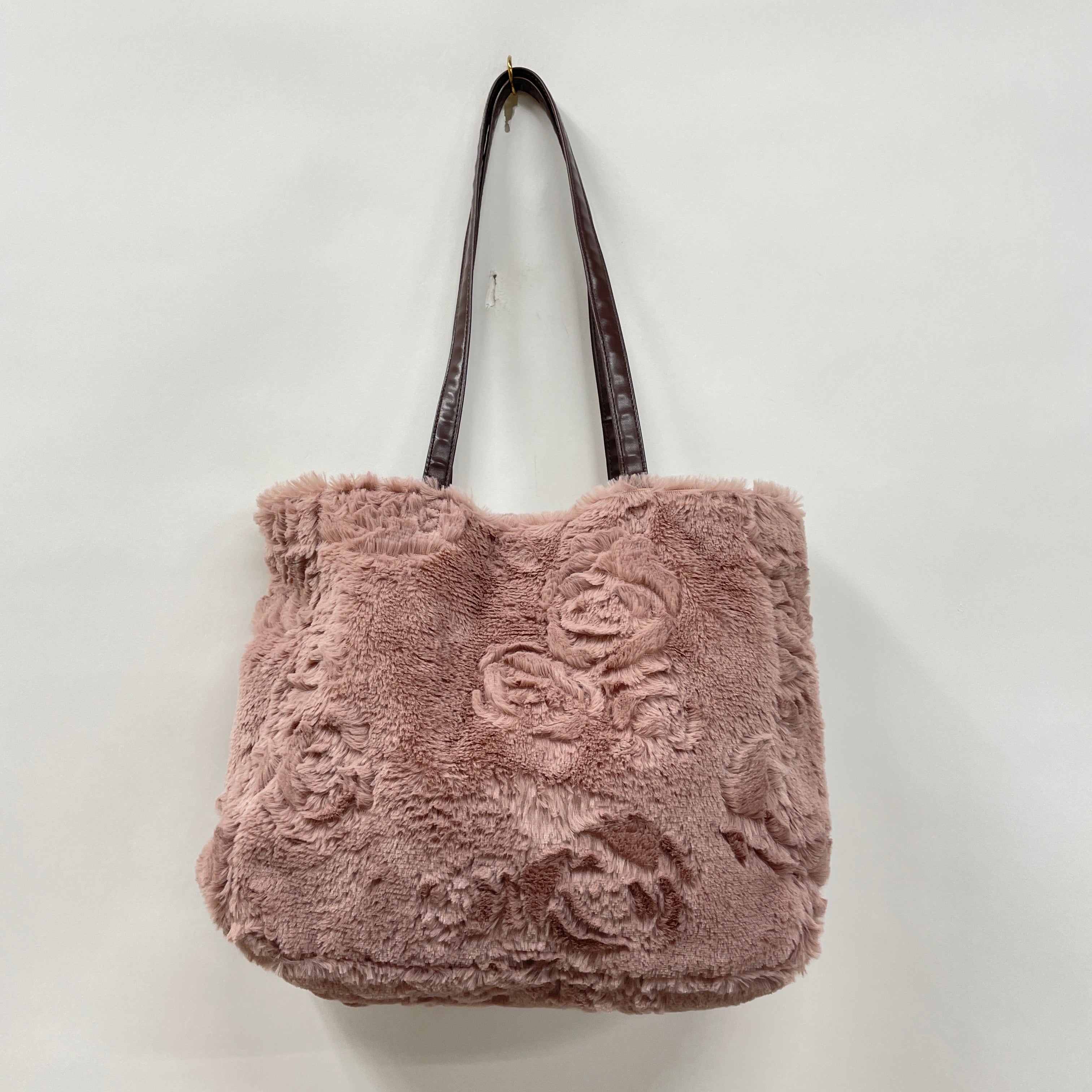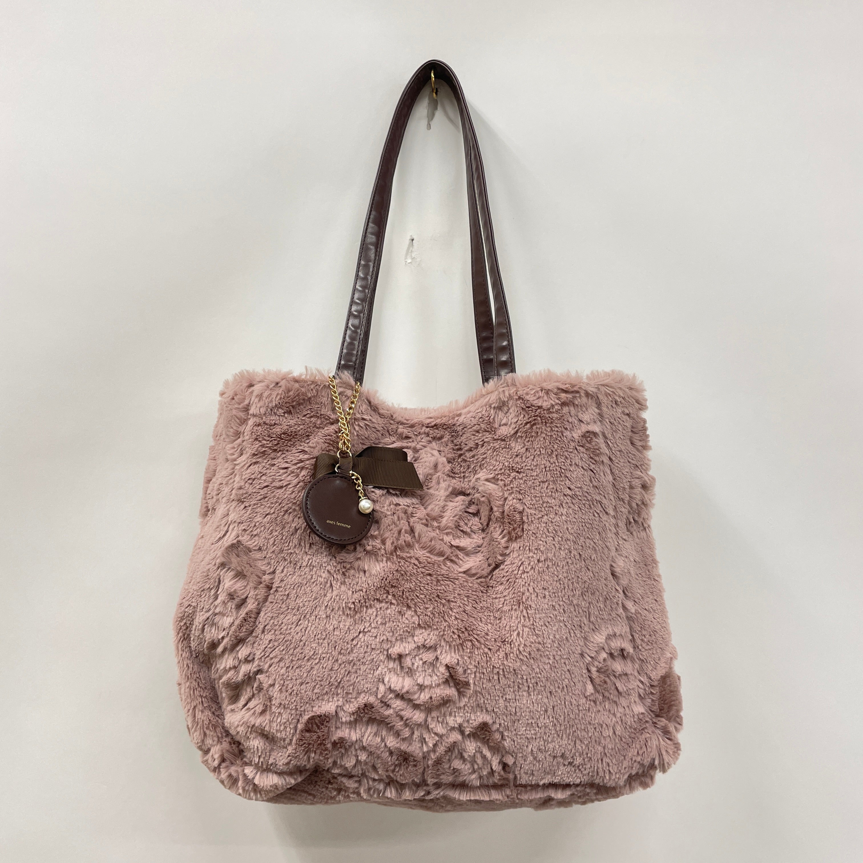 オリジナルのバラのブーケ柄のエンボスを施したファーバッグです。触り心地の良い生地感が可愛く、容量もばっちりのサイズ感。リボンチャームもアクセントになります。