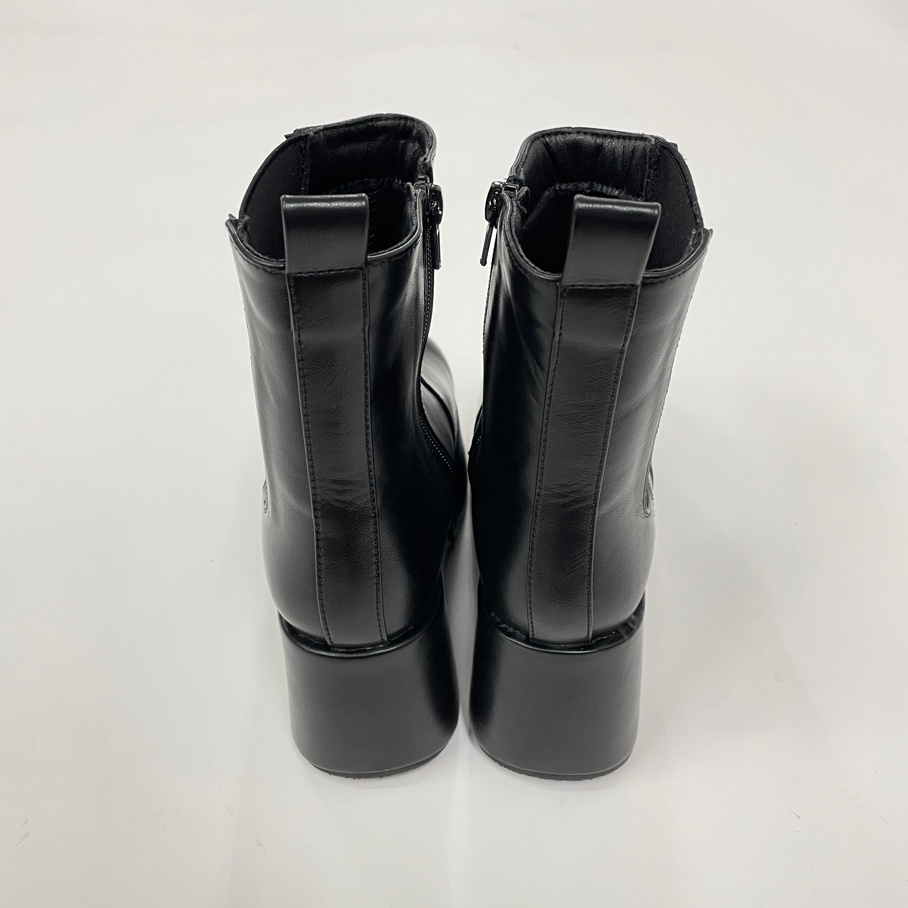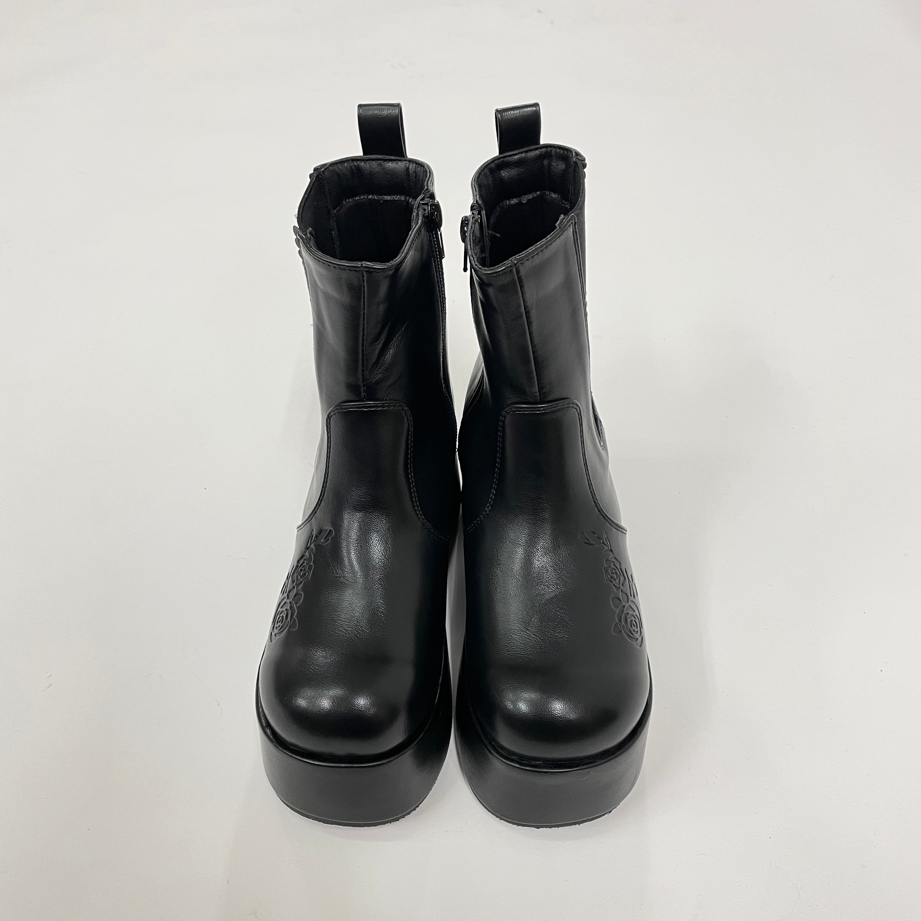 サイドにほどこした薔薇エンボスデザインがポイントの厚底ブーツです。
