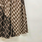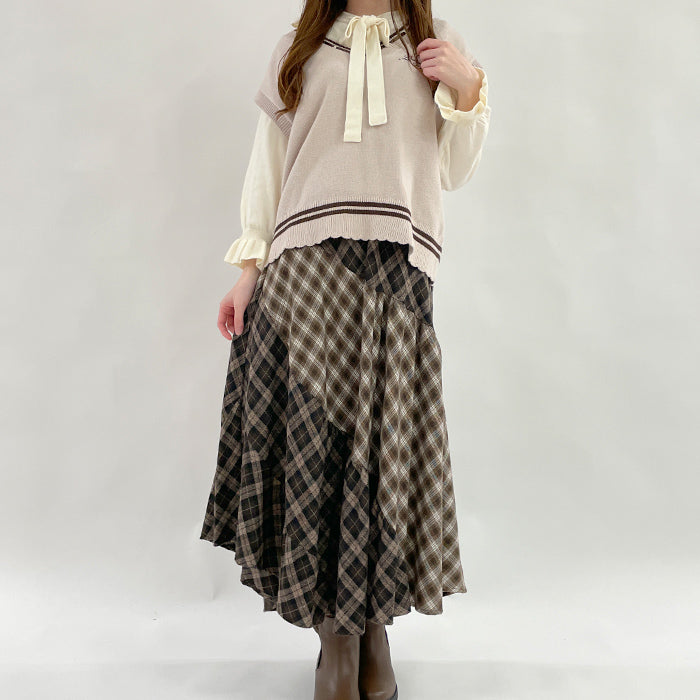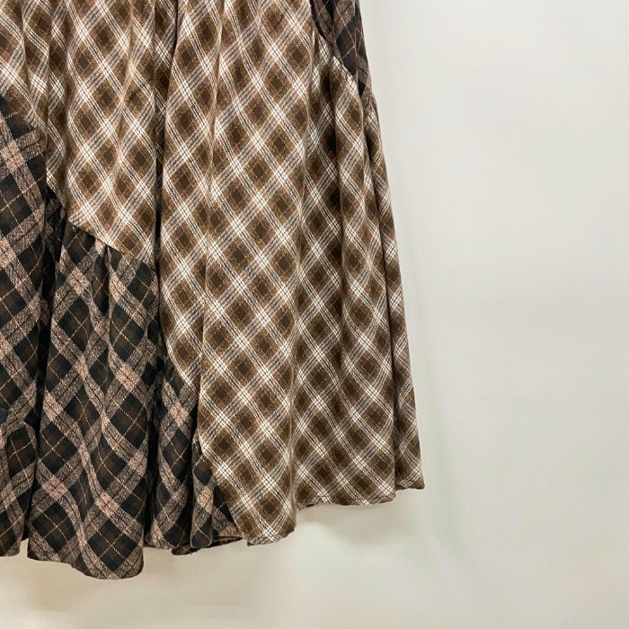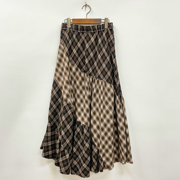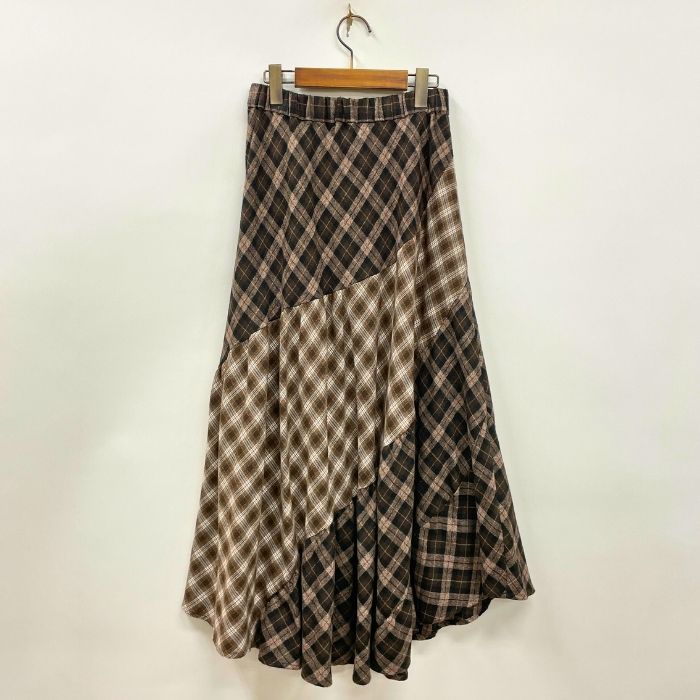 サッシュベルトがセットになったロングスカートです。チェック生地を組み合わせたエスカルゴスカートはボリュームがありつつもきれいなシルエットを作り上げます。起毛チェックなので冬の時期まで長く着用できます。ウエストは総ゴムで着やすさも。