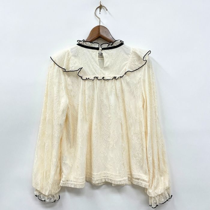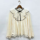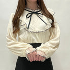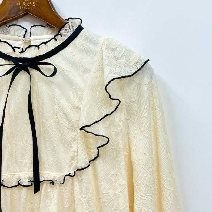 上品なプチスタンド襟に映える、配色のメローフリルとサテンリボンがポイント。