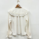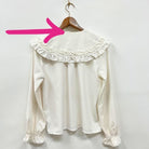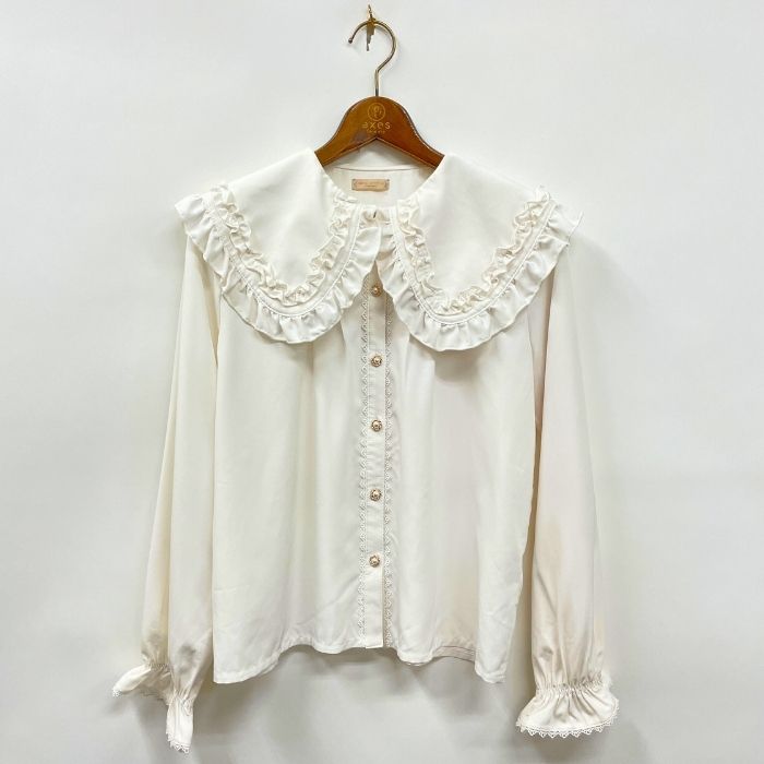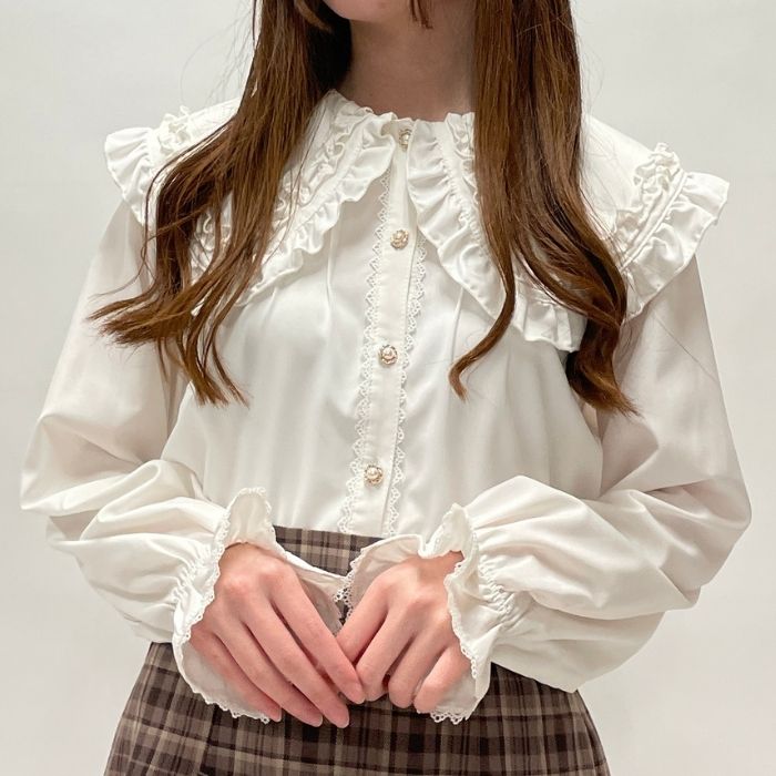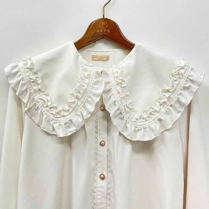ガーリーさ満点の衿のフチにはギャザーがたっぷり寄せられ、まるでホイップクリームがあしらわれたようなデザイン。ニットから衿だけだしたり、ジャンパースカートの中に着用するのもオススメ!