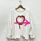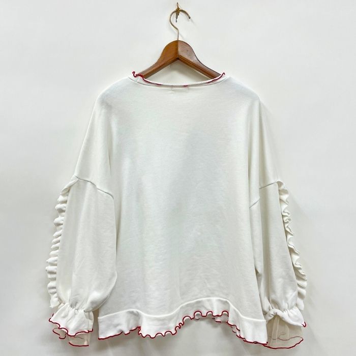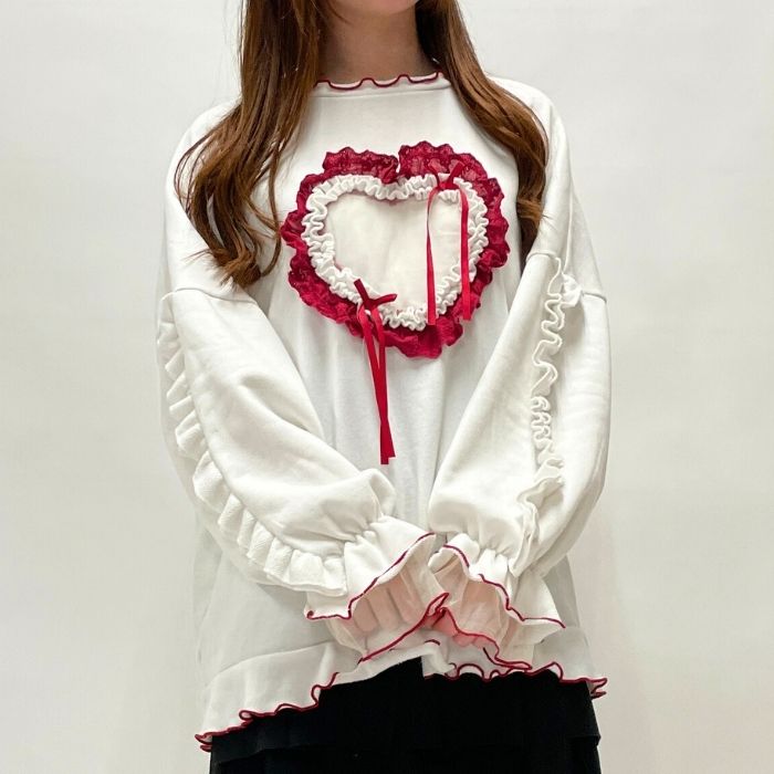 トレンドのフリルハートがポイント。胸元にフリルで囲んだハートがアクセントなデザイン。袖や裾にも繊細なフリルを施し、ガーリーさを存分にプラスしました。たっぷりとしたシルエットが抜け感を演出し、リラックス感のある雰囲気に。【スタイリング】