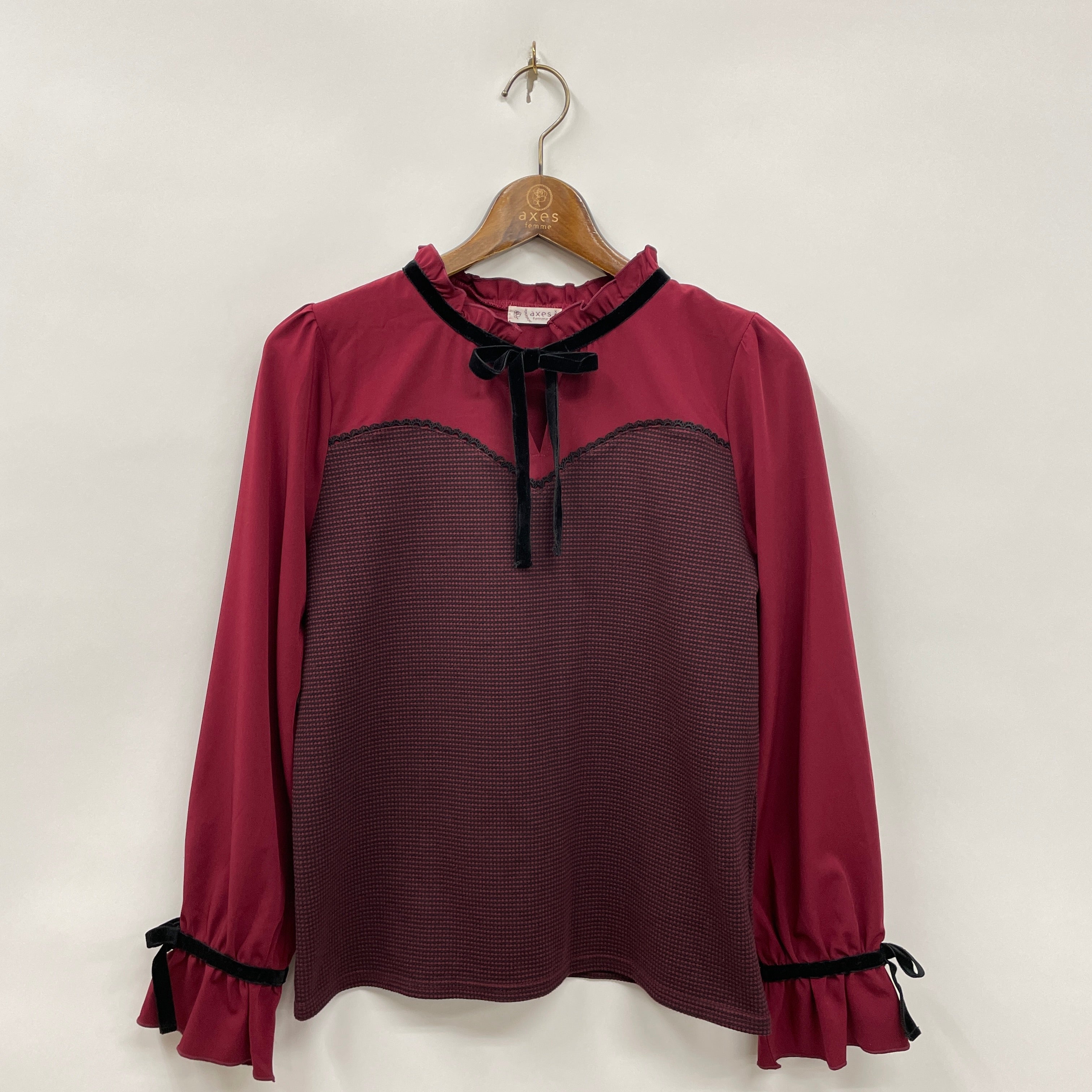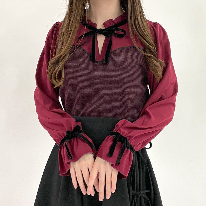 ネックラインと袖口にベロアリボンをあしらい、ワインと茶は配色リボンで華やかに、黒は同色でシックな印象に仕上げています。
