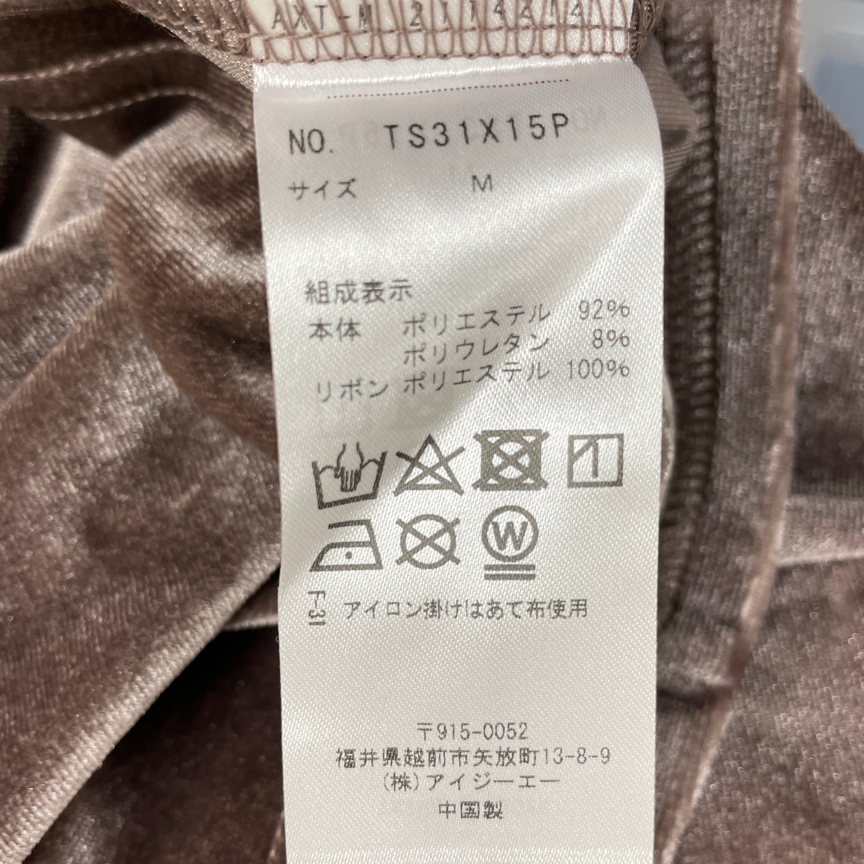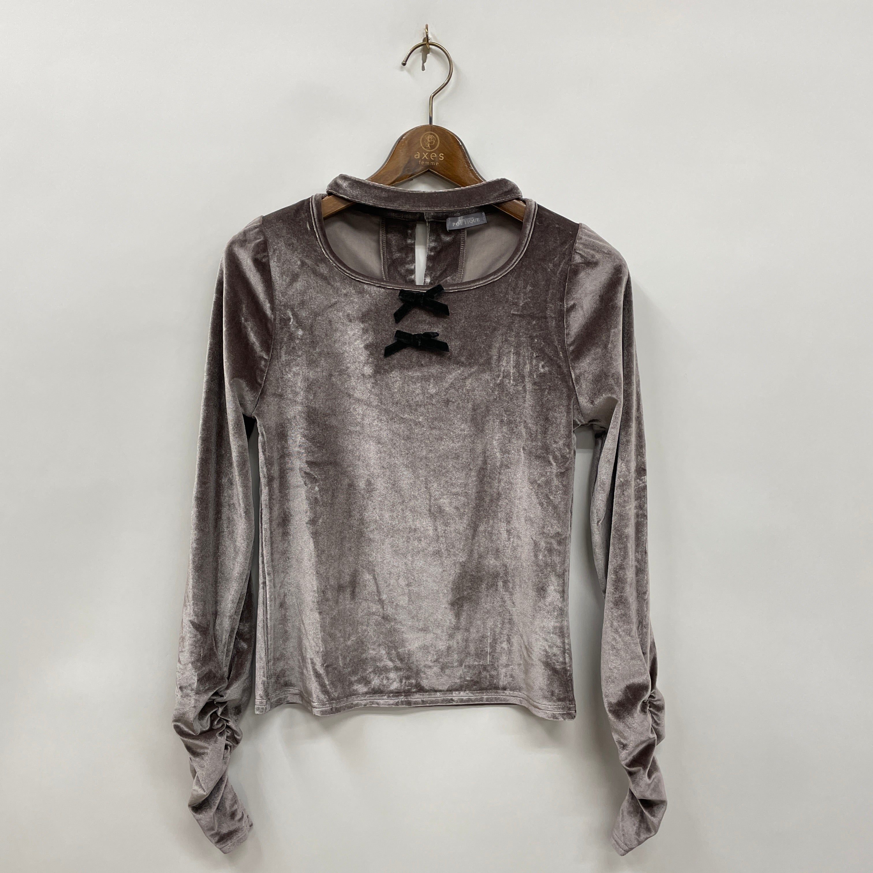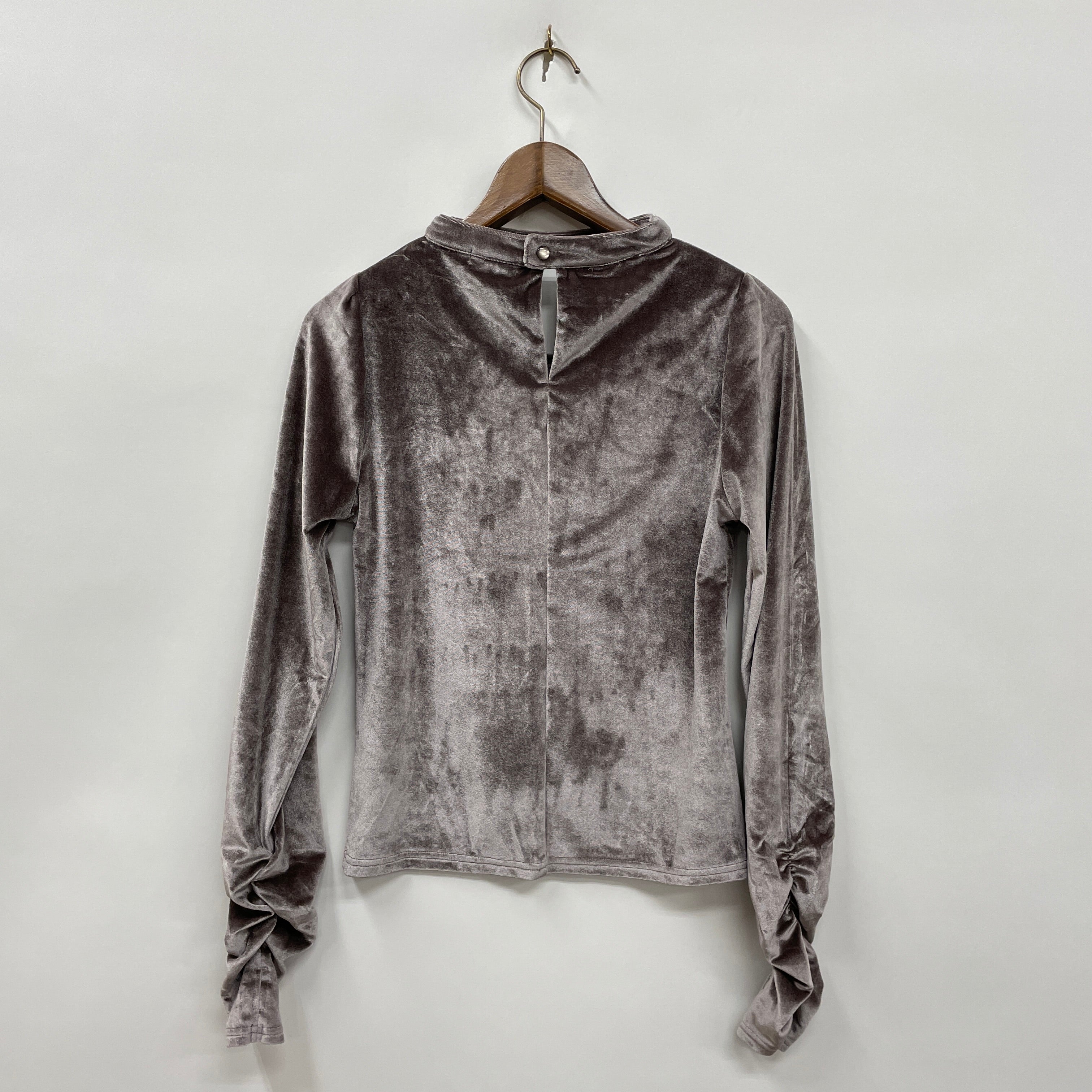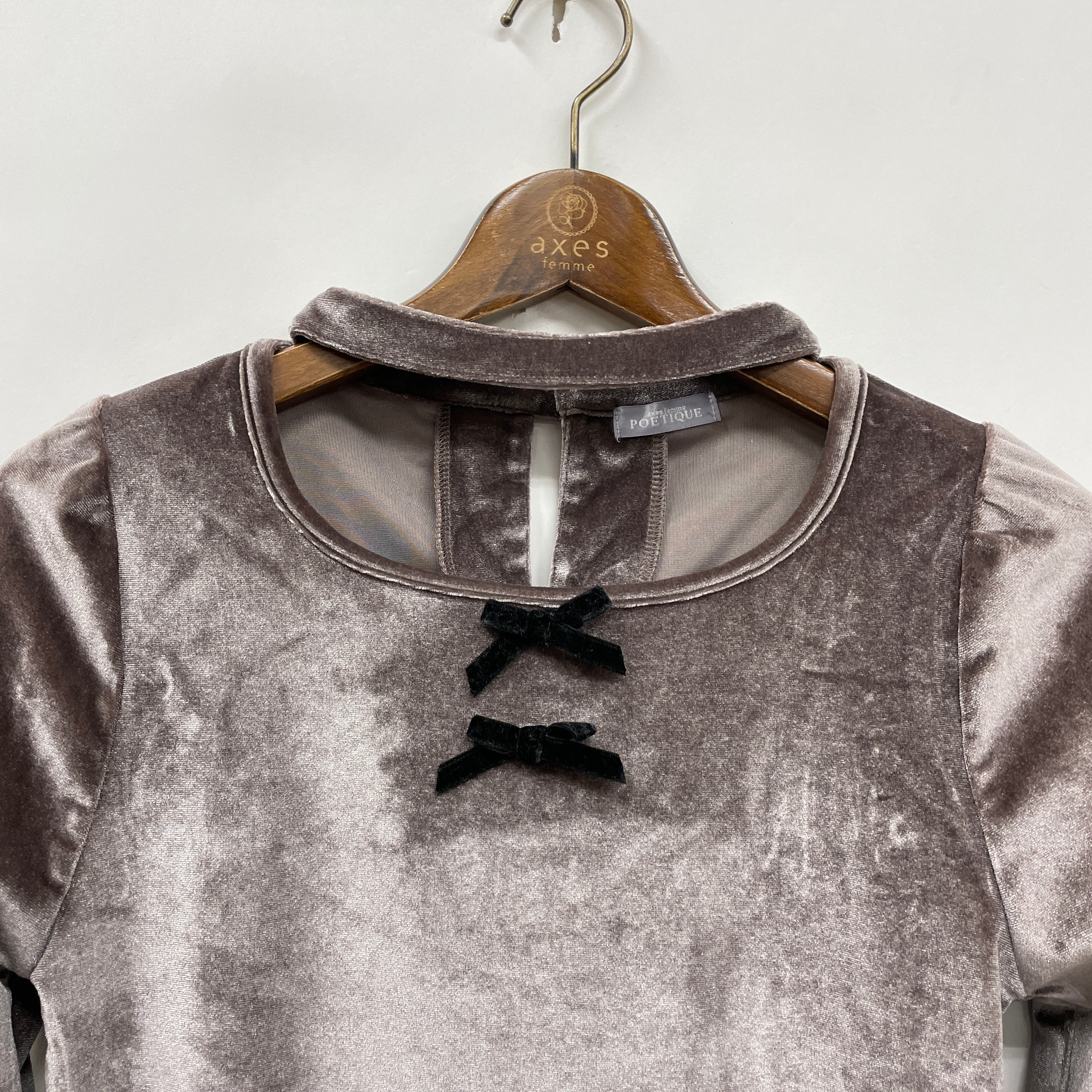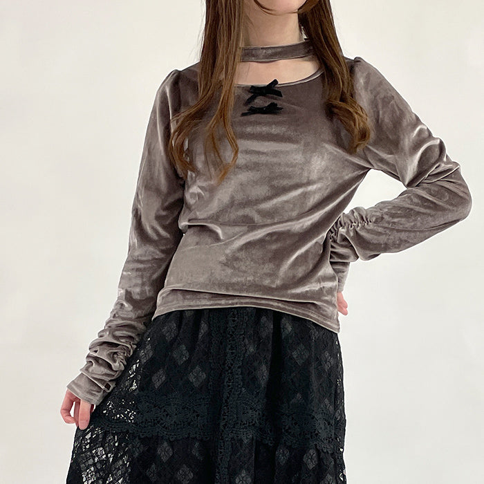伸縮性のあるベロア素材で胸元にはベロアリボンがあしらわれています。チョーカー風デザインと袖口にはサムホール付きでトレンドライクな1着です。