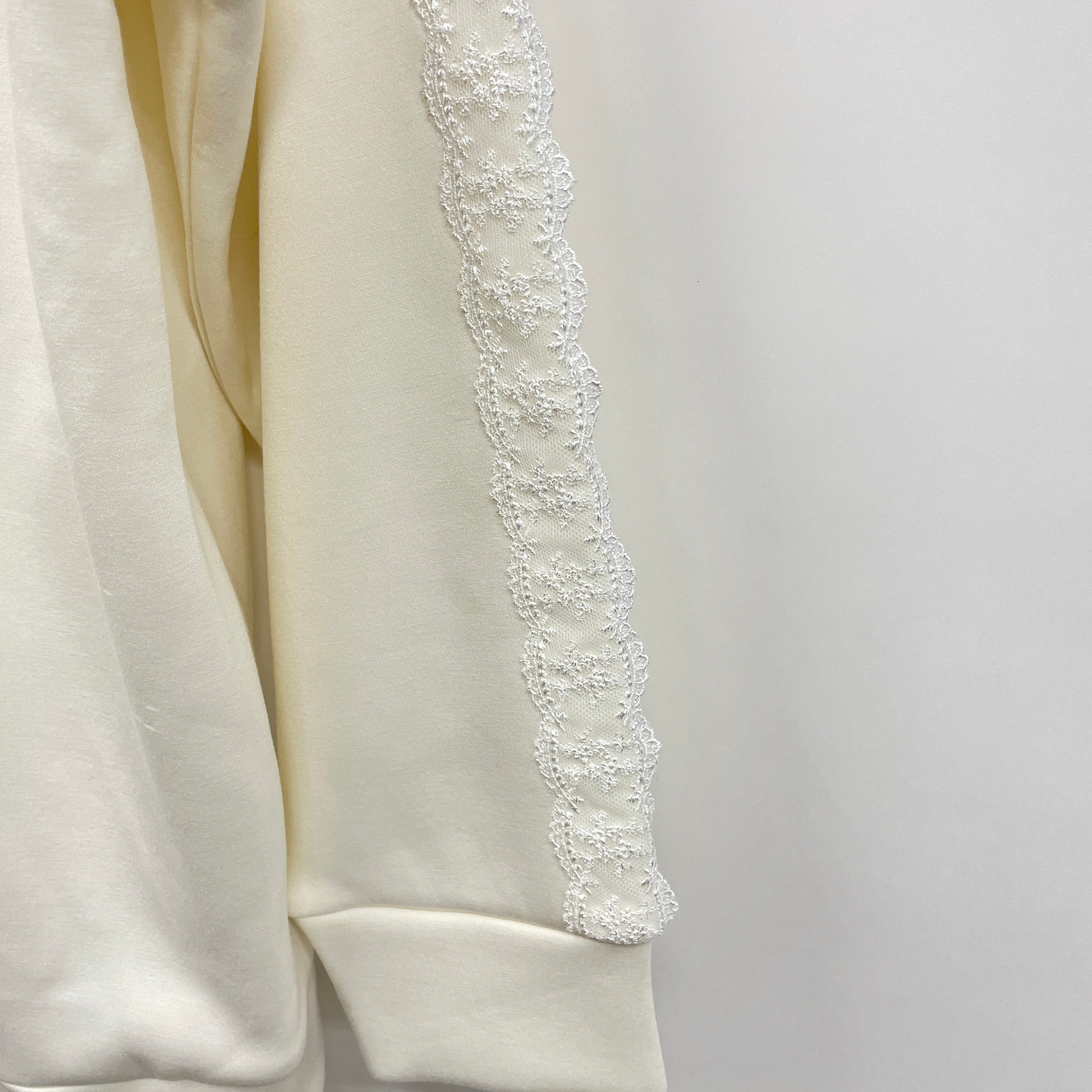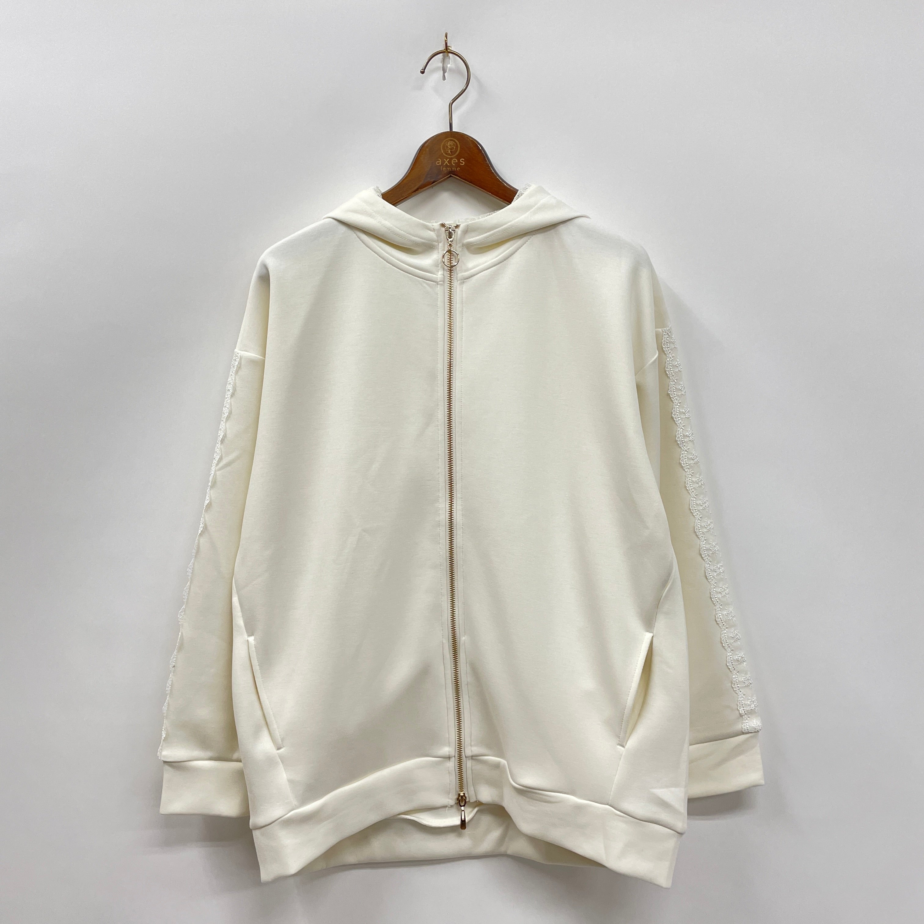 フード裏にはレース生地を重ね、袖山には繊細な柄のチュールレースを付けたデザインで、フェミニン感をプラス。