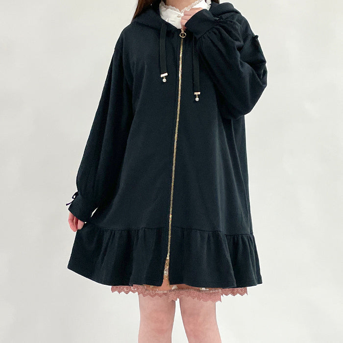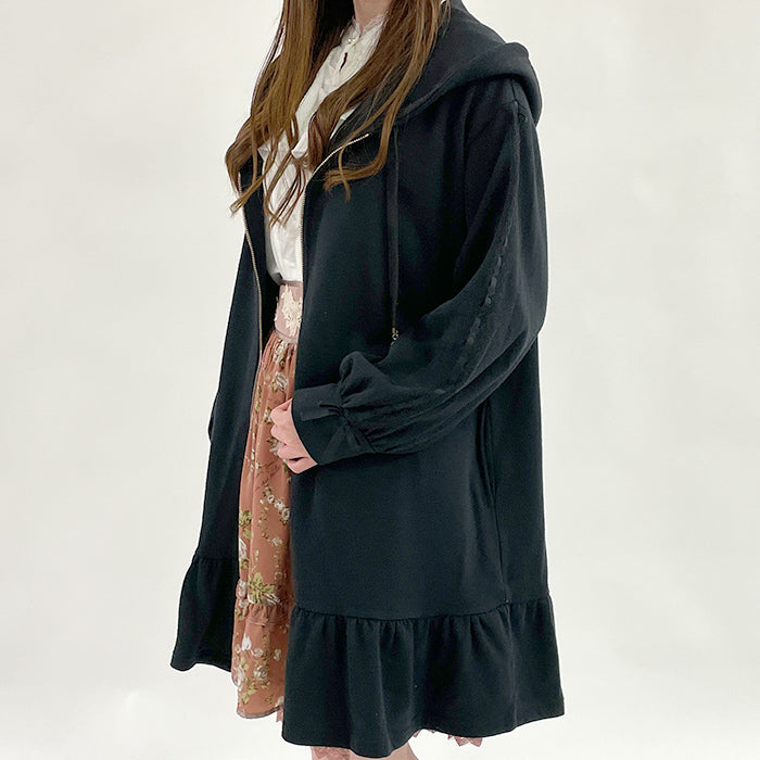 季節の変わり目の羽織におすすめな軽い素材を使用したロング丈のパーカーです。