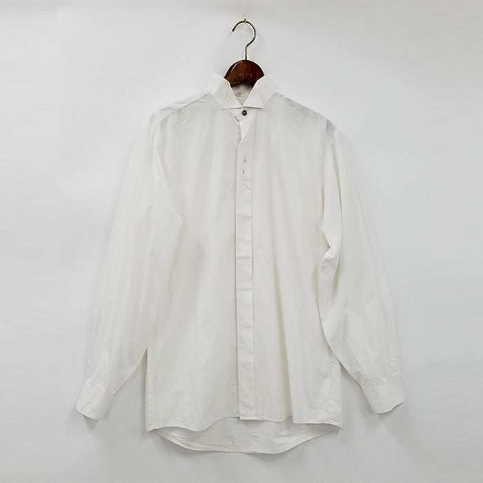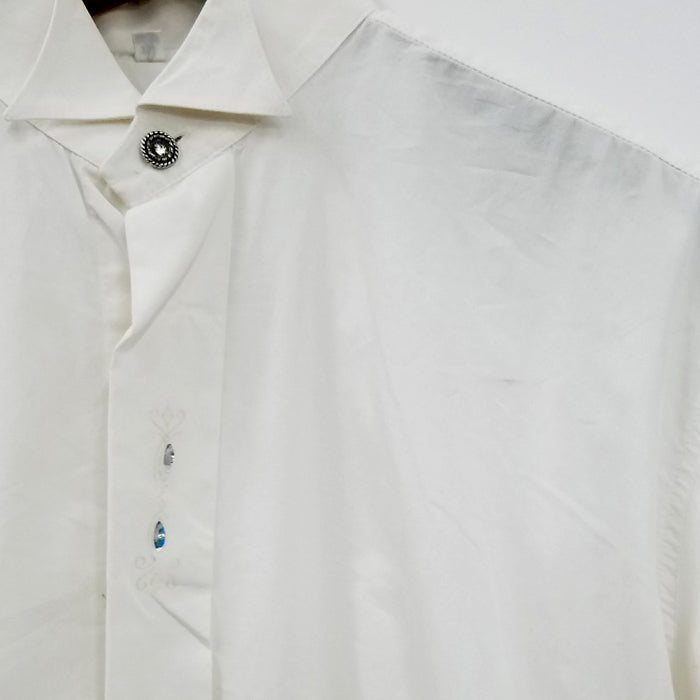 比翼仕立ての部分にあしらわれた刺繍やラインストーン、ボタンのデザイン、ウイングカラーなど細かなデザインのこだわりが魅力的なシャツです。