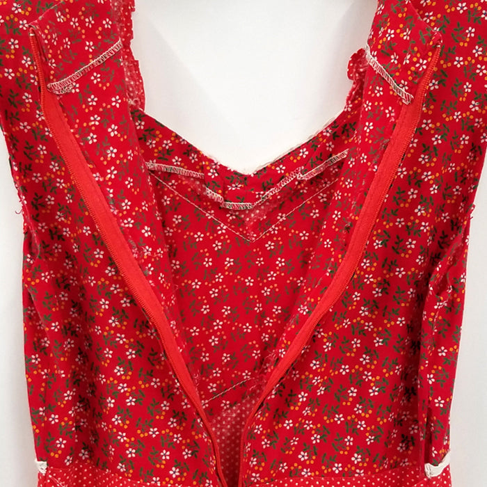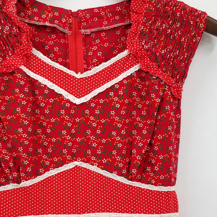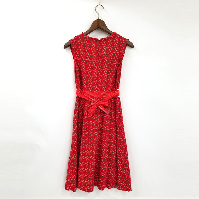 鮮やかな色味と切替が目を引くノースリーブのワンピースです。小花柄とドット柄がレトロな雰囲気を醸し出します。