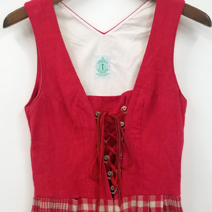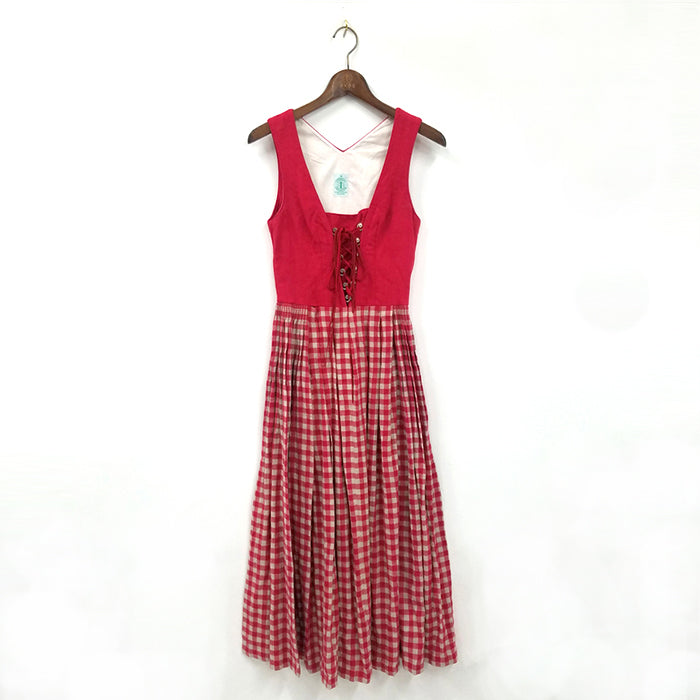 ギンガムチェックやレースアップ、金具が目を引くジャンスカです。ドイツ製でヨーロッパの伝統的な雰囲気を味わえます。