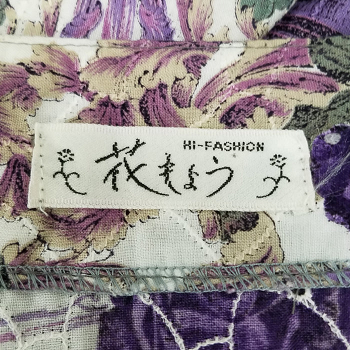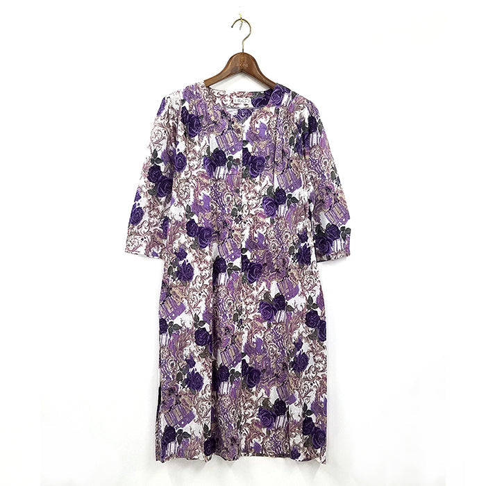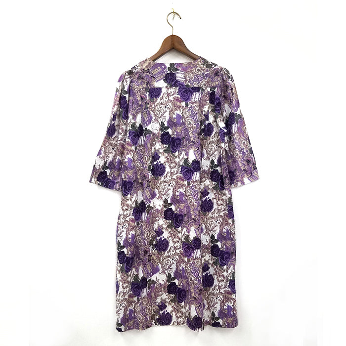 レースの襟と紫のバラや建物の柄があしらわれたワンピースです。昭和の日本製で、当時らしいデザインを楽しめます。