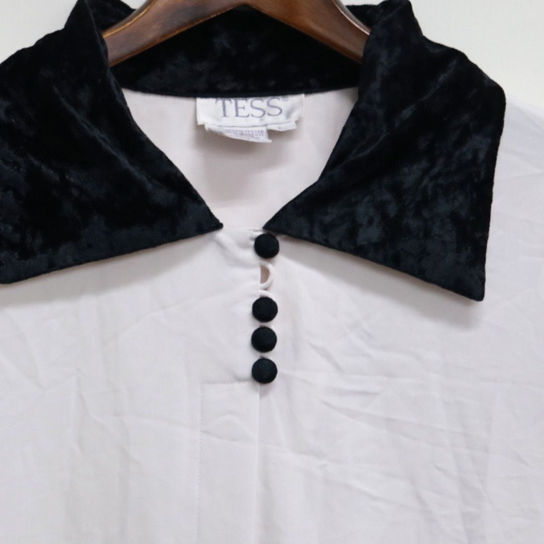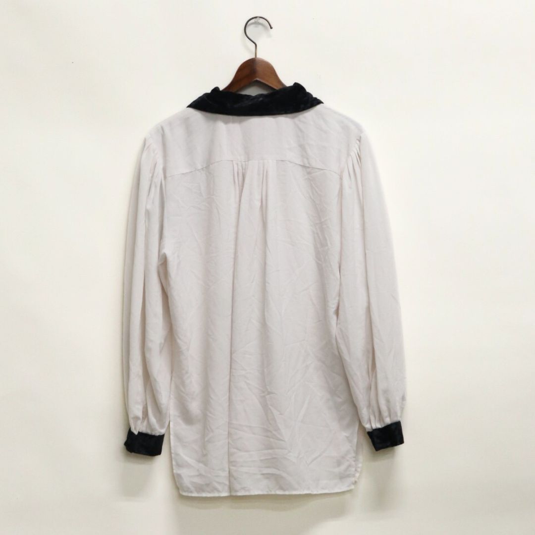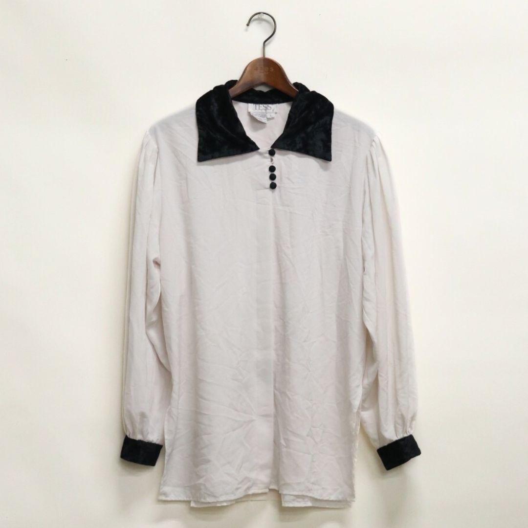 襟、袖口、ボタンが黒で統一されたおしゃれなシャツです。きれいめなアイテムです。