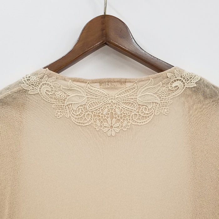 しゃり感のあるサラっと羽織れるニットカーディガンです。バックのモチーフレースがポイントです。ロング丈なので、着るとすっきりしたシルエットになるので、パンツスタイルに合わせるのがオススメです。