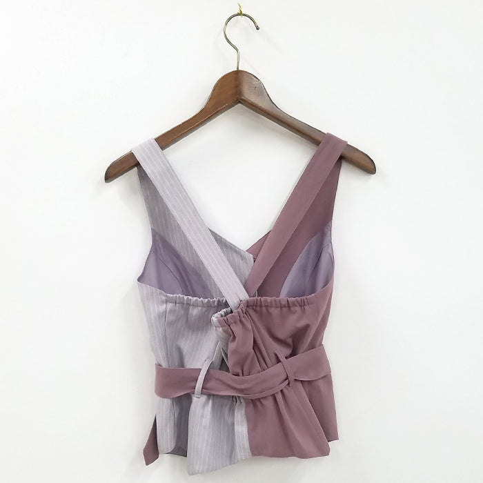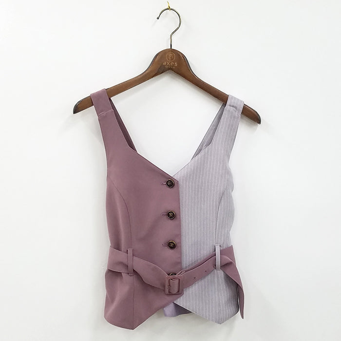 ベストにも人気のバイカラーアイテムが登場です。お揃いのベルトも付いてスタイリングに大活躍です。ブラウスはもちろん、カットプルオーバーとカジュアルミックスにしても◎。