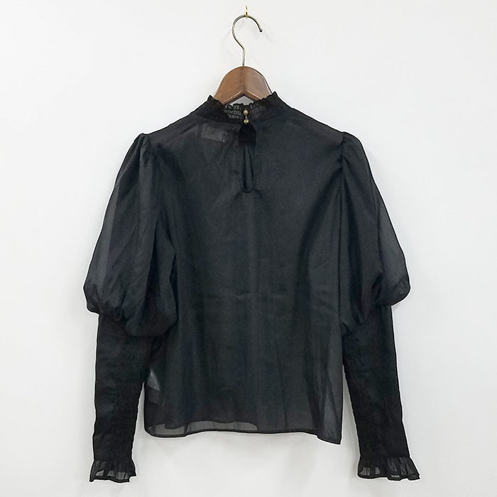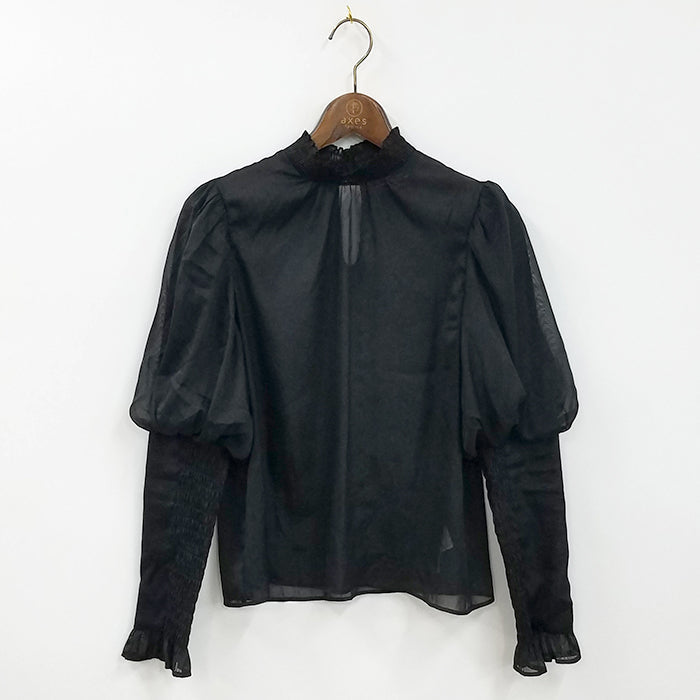 やわらかなラメシフォンのブラウスは、ふんわりとした袖デザインと着やすいシャーリングネックがポイント。