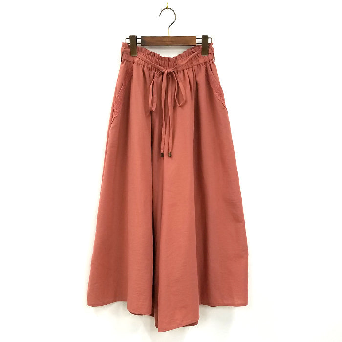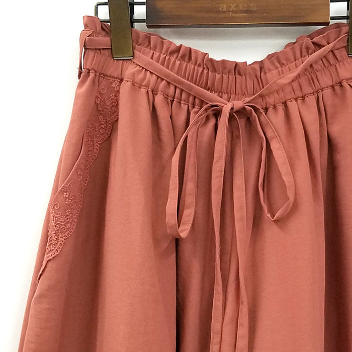 ウエストはゴム仕様で履きやすく、裾幅もたっぷりした分量があるので動きやすいのがポイント。