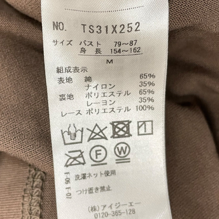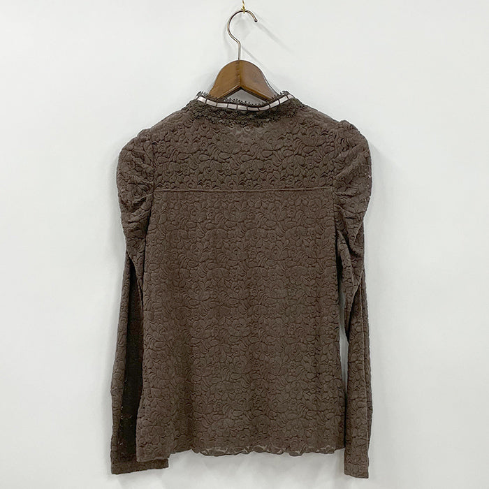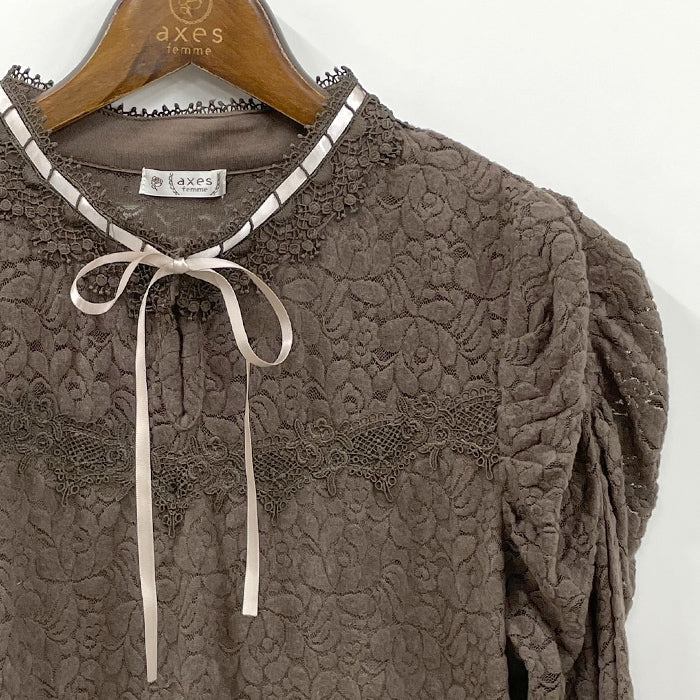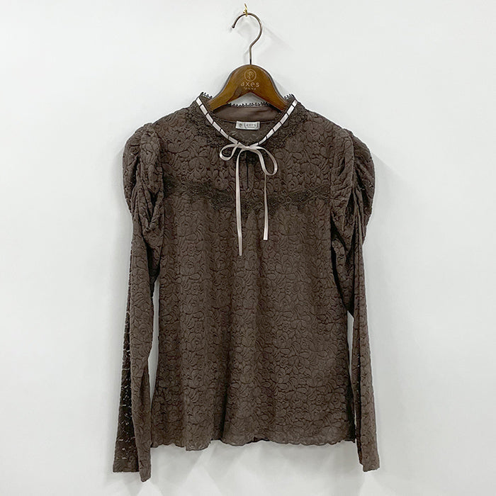 起毛レースを使用したトップスです。ネック部分とヨーク切り替えラインに上品なレースがあしらわれています。ネックの部分ははしごレースになっておりフロント部分でリボンを結ぶ仕様になっています。