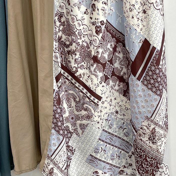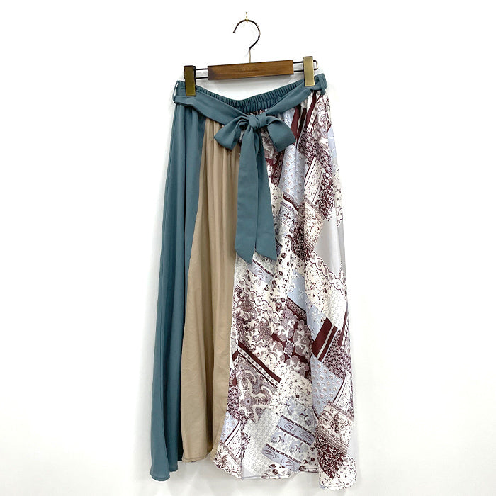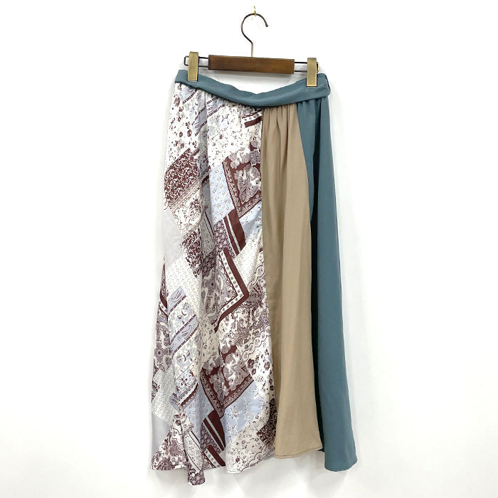 無地とスカーフ柄でパッチワークデザインに仕上げたミディスカートです。ウエストは総ゴムで着やすさ◎。カラーによって雰囲気ががらりとかわるアイテム。ブルゾンやTシャツあわせのカジュアルスタイリング、シックなブラウスを合わせてエレガントにも着こなせるアイテムです。