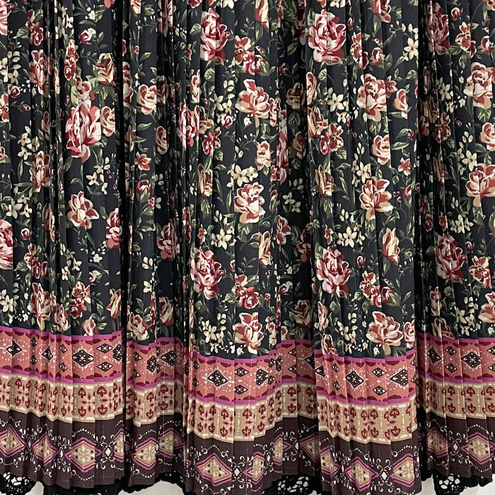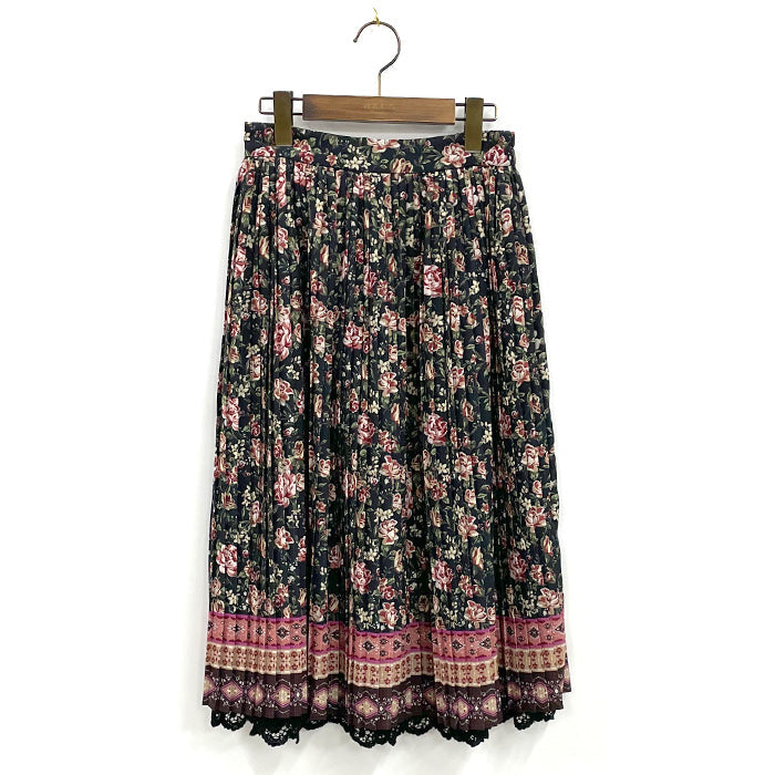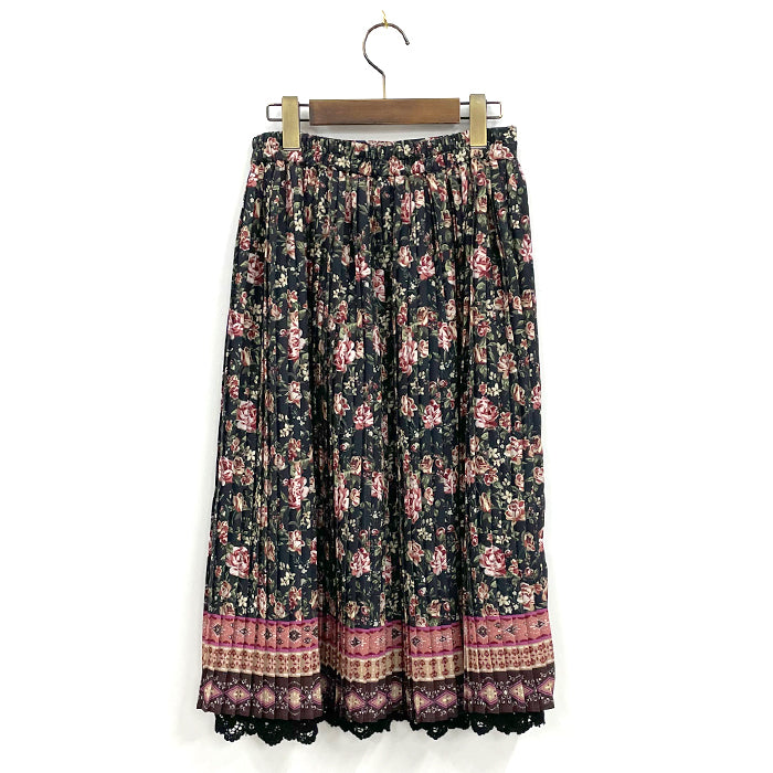上品な花柄に裾の部分がちょっとエスニック感のあるボーダー柄を組み合わせたプリーツスカートです。これからの季節にぴったり!なスカートです。細く幅の狭いアコーディオンプリーツ加工を施しております。ブラウスなどと合わせるのはもちろんのこと、華やかさがあり女性らしい印象だからこそ、カジュアルなアイテムを合わせてもバランスが取れておしゃれにきまります!ウエストはゴム仕様なのも嬉しいポイント◎