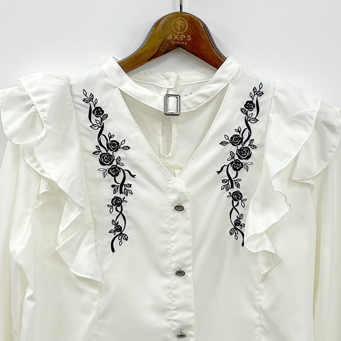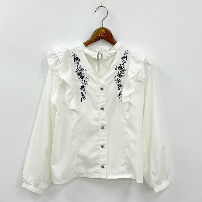 繊細なローズ刺繍がポイントのブラウスです。クラシカルなチョーカー風デザインとフロントの程よい肌みせが◎。