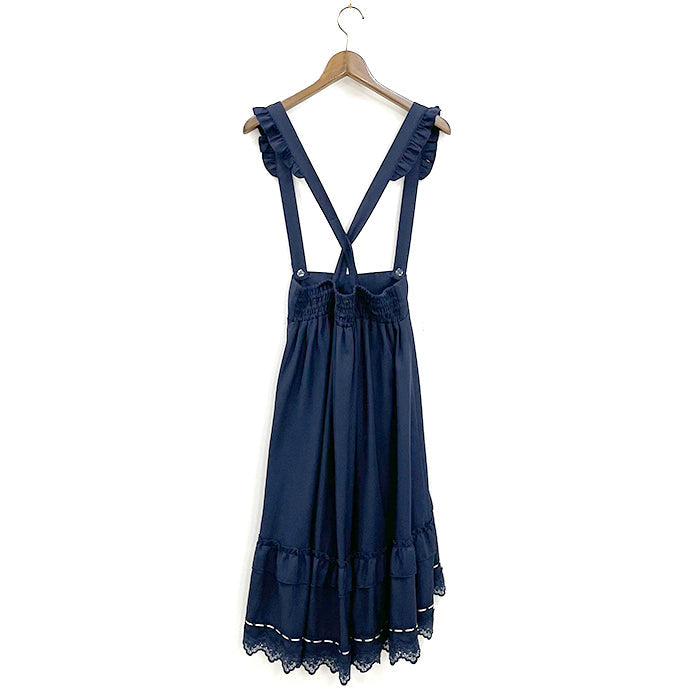 肩のプチフリルがポイントのサスペンダー付きスカート。サスペンダーは調整可能です。