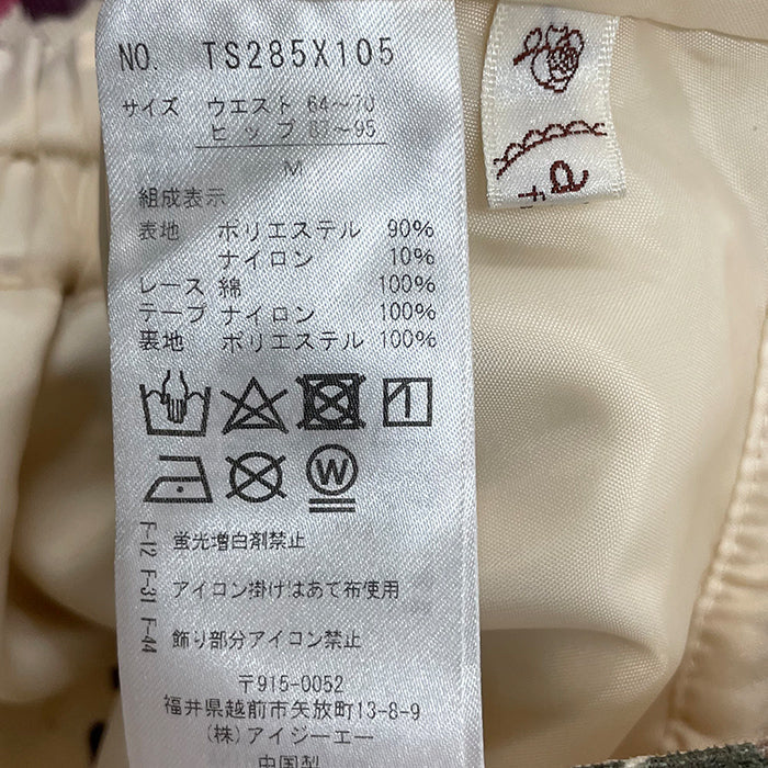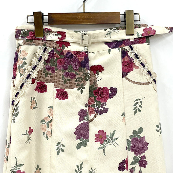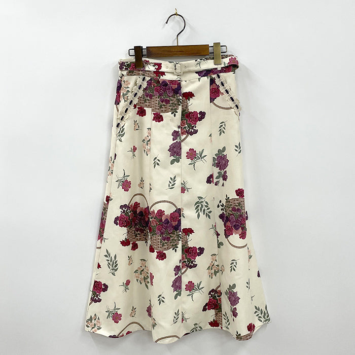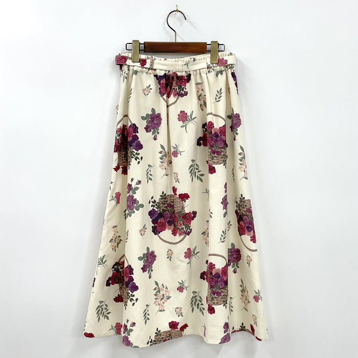 華やかなバスケットブーケ柄が広がる、クラシカルな雰囲気のミディスカートです。