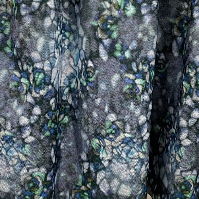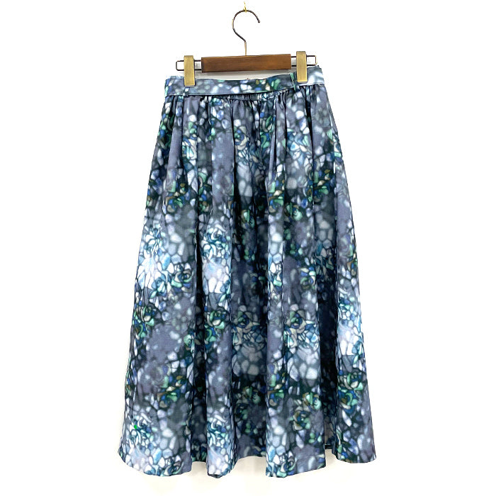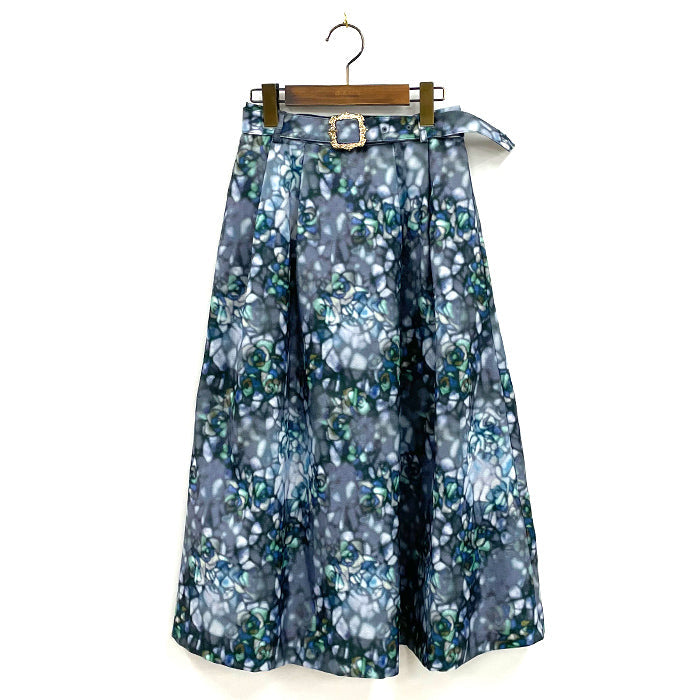 ステンドグラスにランプを灯したようなプリントが華やかなミディスカート。バックルデザインにもこだわったアイテム、1枚で主役になれるコーデが完成します。