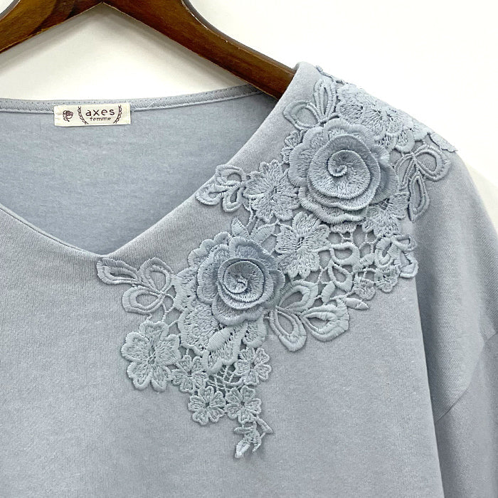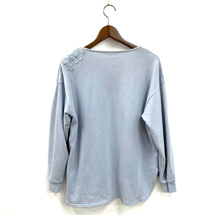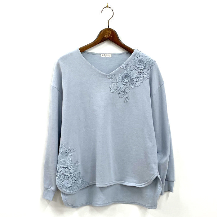 左胸元と右裾にモチーフレースが華やかにあしらわれた、アシンメトリーデザインのカット素材のプルオーバーです。サイドスリットと前後差が今年らしいデザインなのでインスタイルでもアウトスタイルでも着やすいアイテム。パンツ合わせのスタイリングがオススメです。