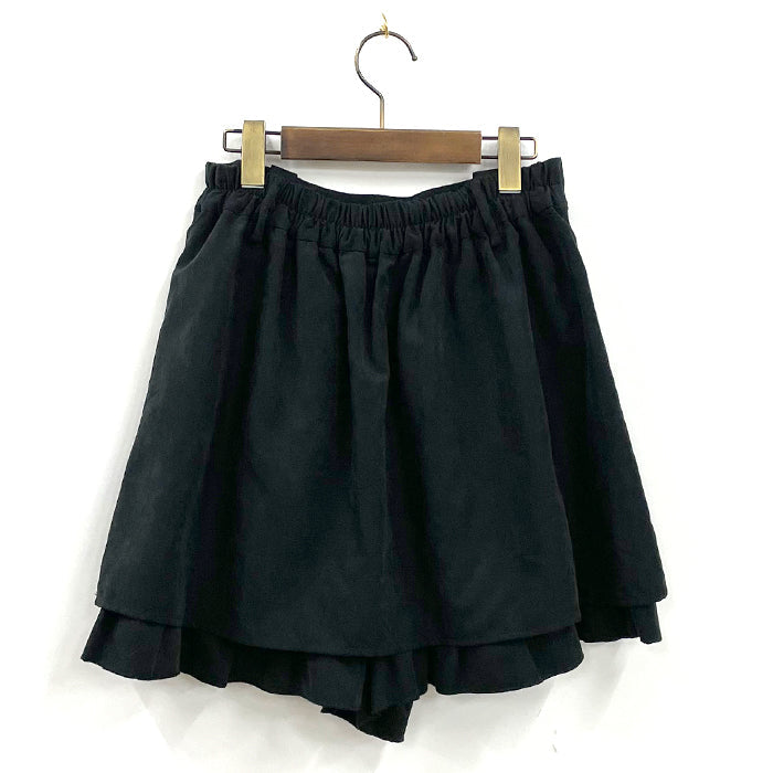 ベルトのついたフレアキュロットです。裾からのぞくフリルも共布なので甘すぎないのがポイントです。合わせやすい無地なので、ゆったりしたニットなどと合わせても◎