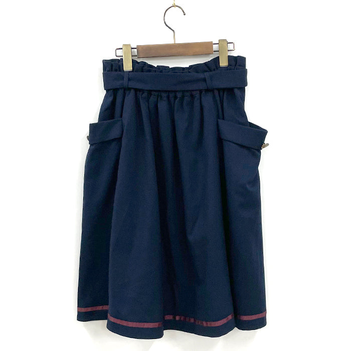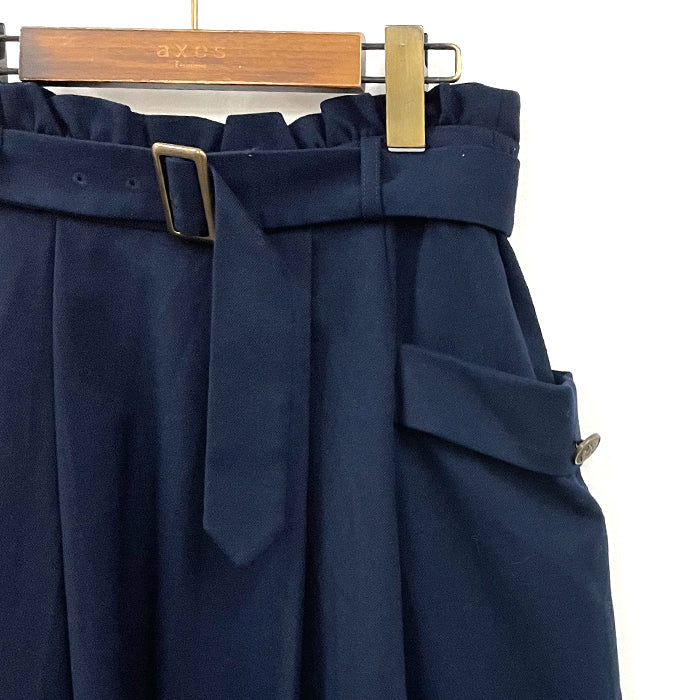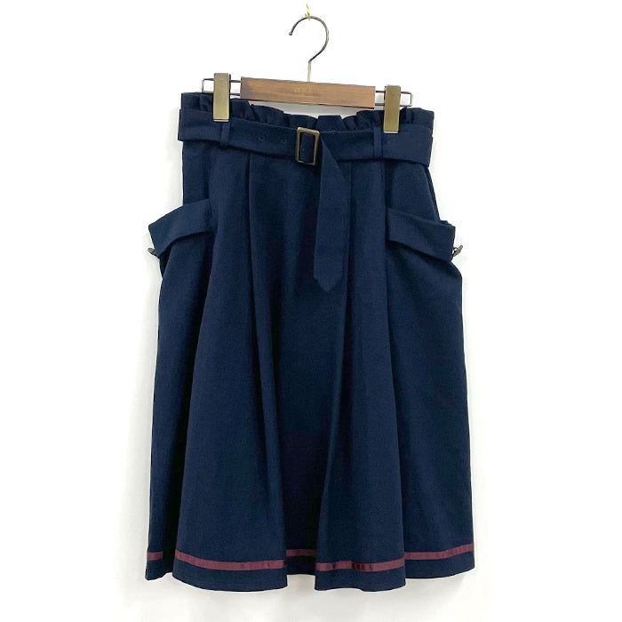 大きなポケットデザインが印象的なスカートです。しっかりとした厚みのある生地を使用しているので、これからの季節にピッタリです。共地のベルト付きでスタイリングに悩まないのが嬉しいポイント。