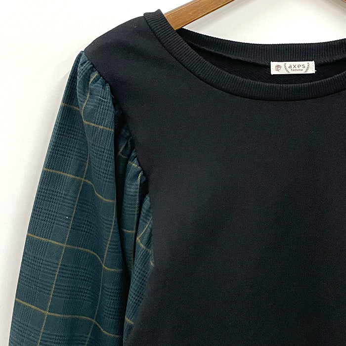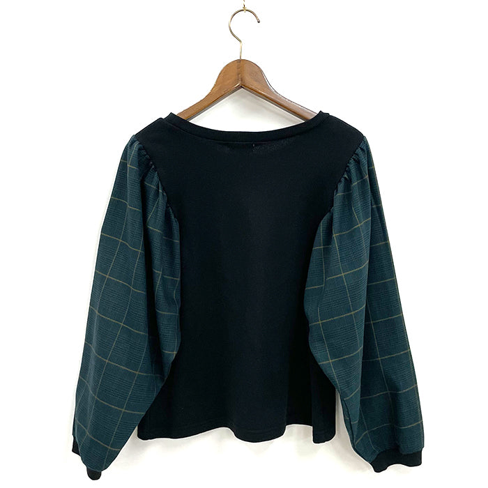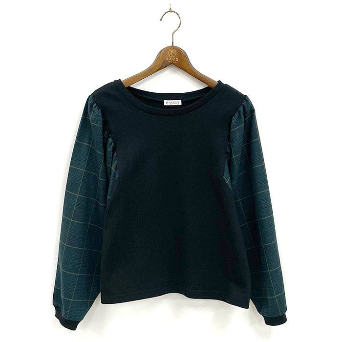 チェック柄生地と切り替えた、袖コンシャスなデザインがポイント。