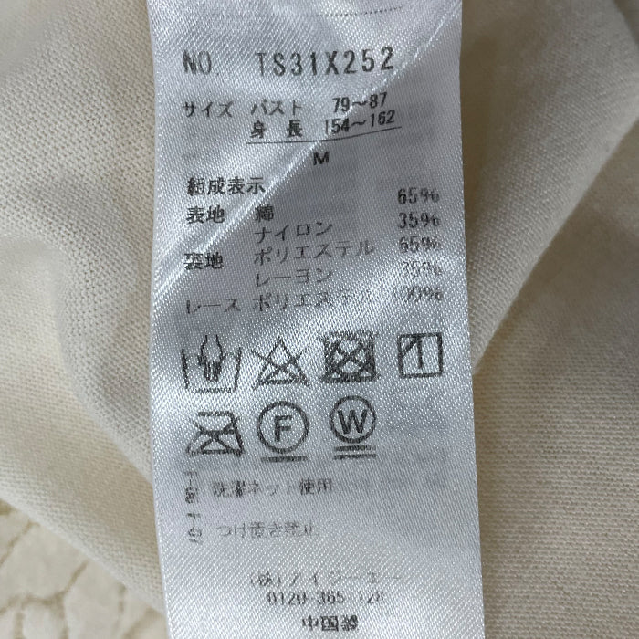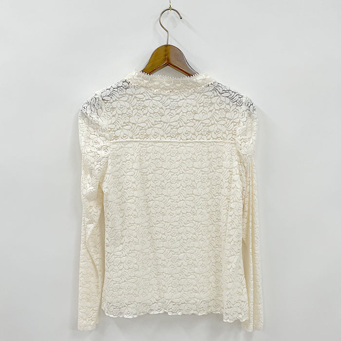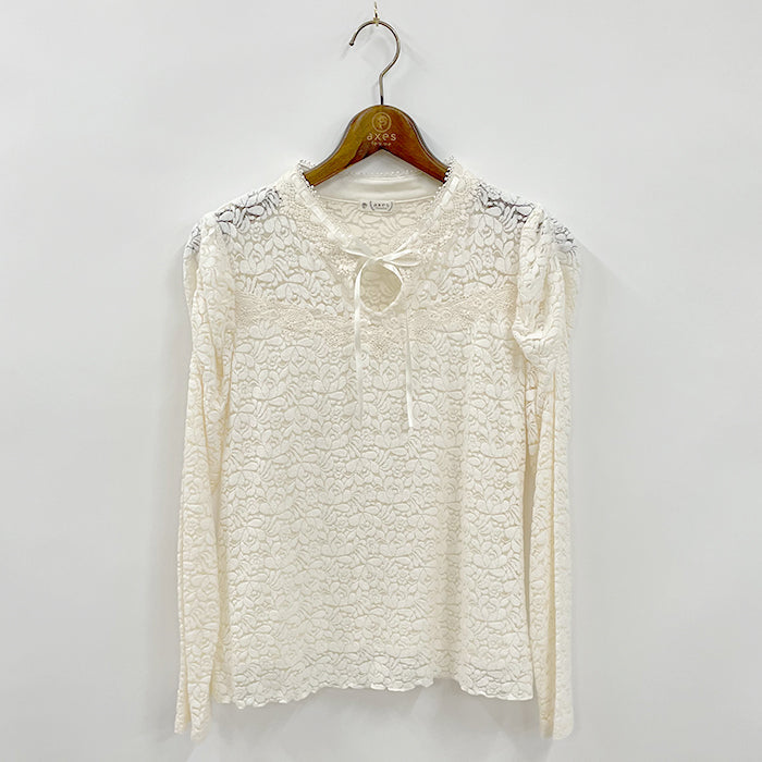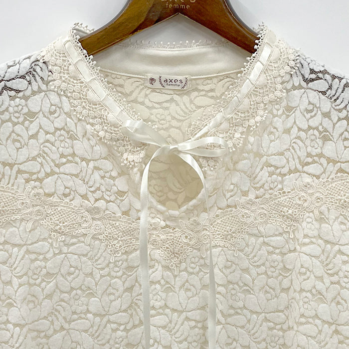 起毛レースを使用したトップスです。ネック部分とヨーク切り替えラインに上品なレースがあしらわれています。ネックの部分ははしごレースになっておりフロント部分でリボンを結ぶ仕様になっています。
