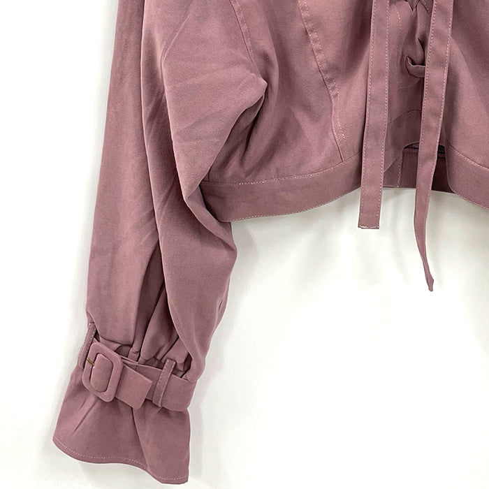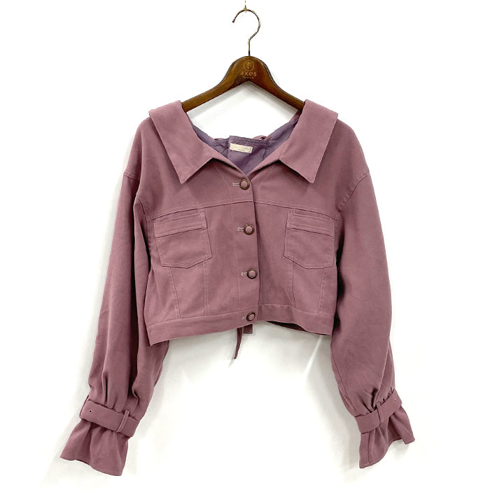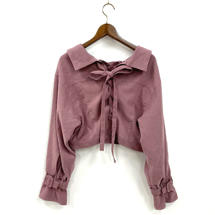 後にレースアップデザインが入ったジャケットです。少し起毛感のある生地が秋を先取りしたアイテム。抜き襟でワンピースなどに合わせるのがお勧めです。