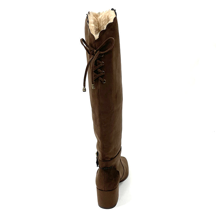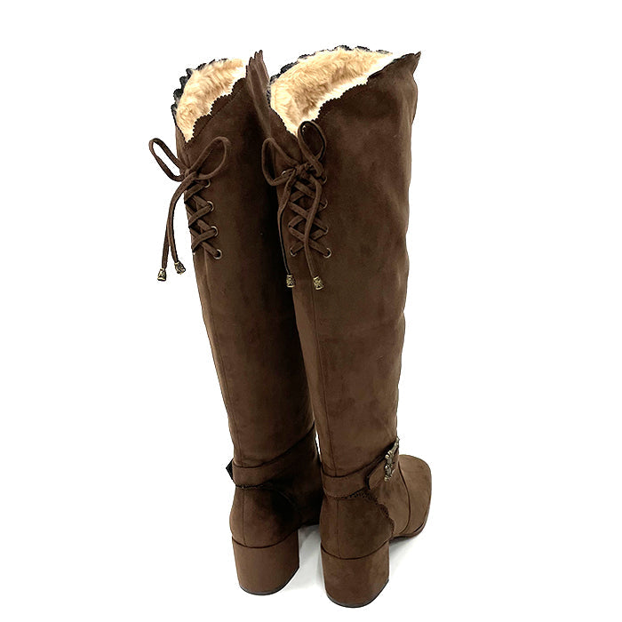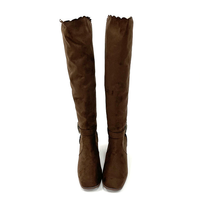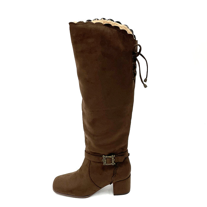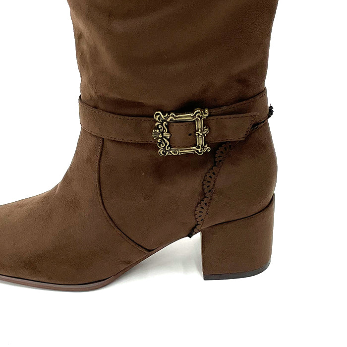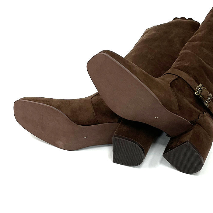 アンティーク調のバックルベルトが足首を飾るロングブーツです。
