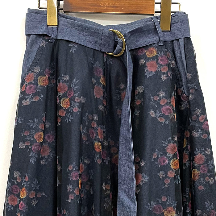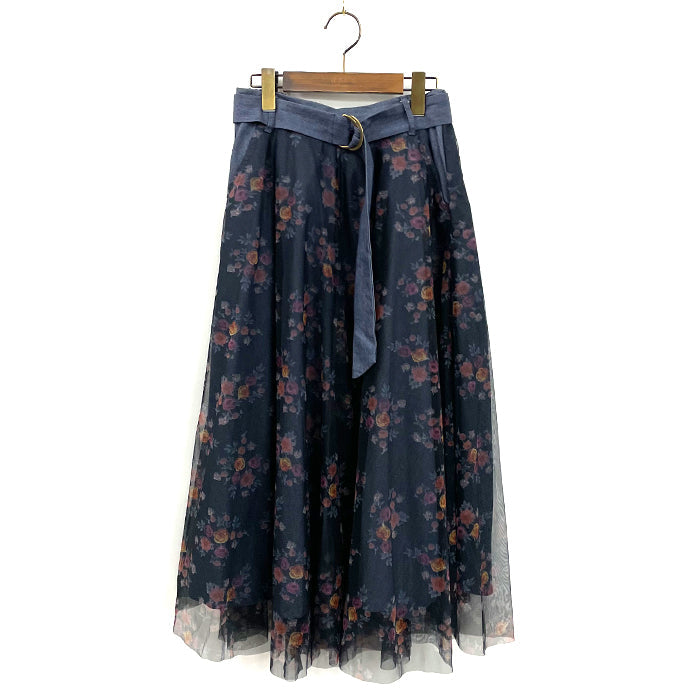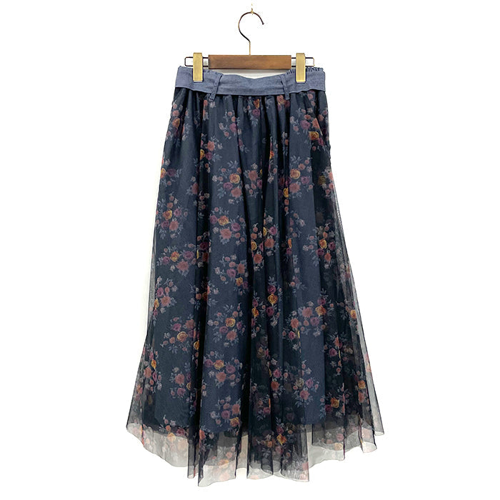 ふんわり広がるチュール生地に、上品な花柄がプリントされたロングスカートです。