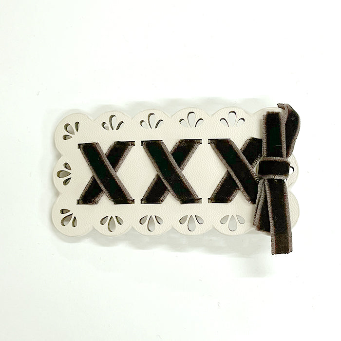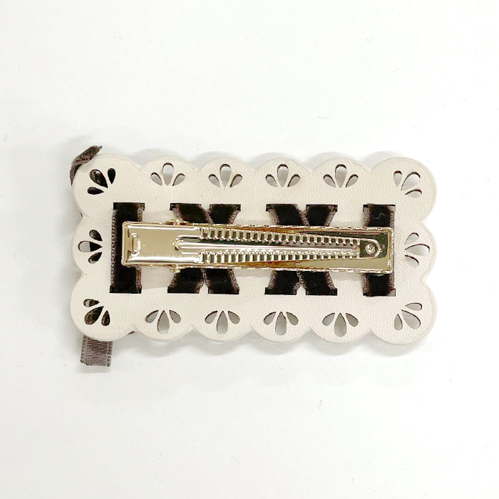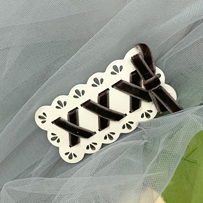 レースモチーフの合皮ワッペンにベルベットリボンがレースアップされたデザインのクリップです。クリップなので簡単に着脱が可能で、厚みがそんなに無いのでおろし巻きのサイドヘアーに付けても◎