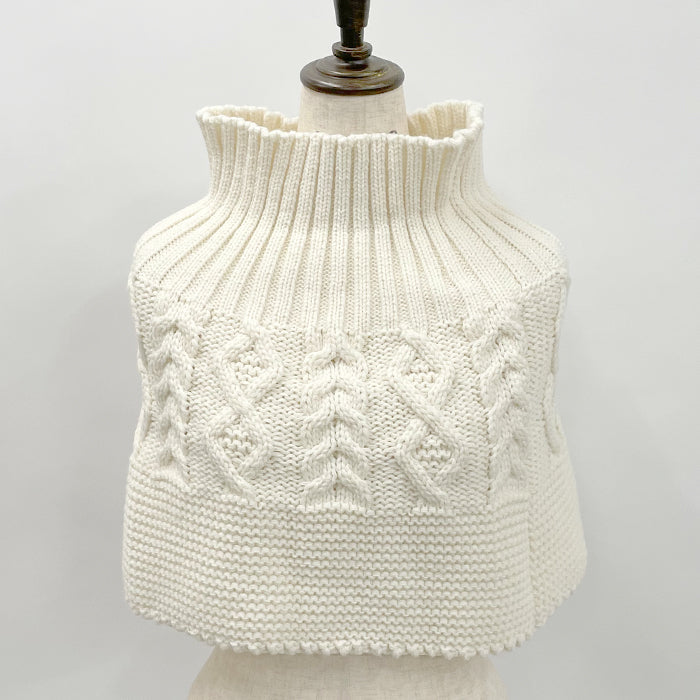 すっきりしたリブニットやワンピースなどに合わせたい、ケーブル編みのニットケープです。