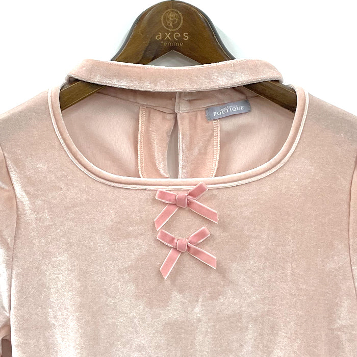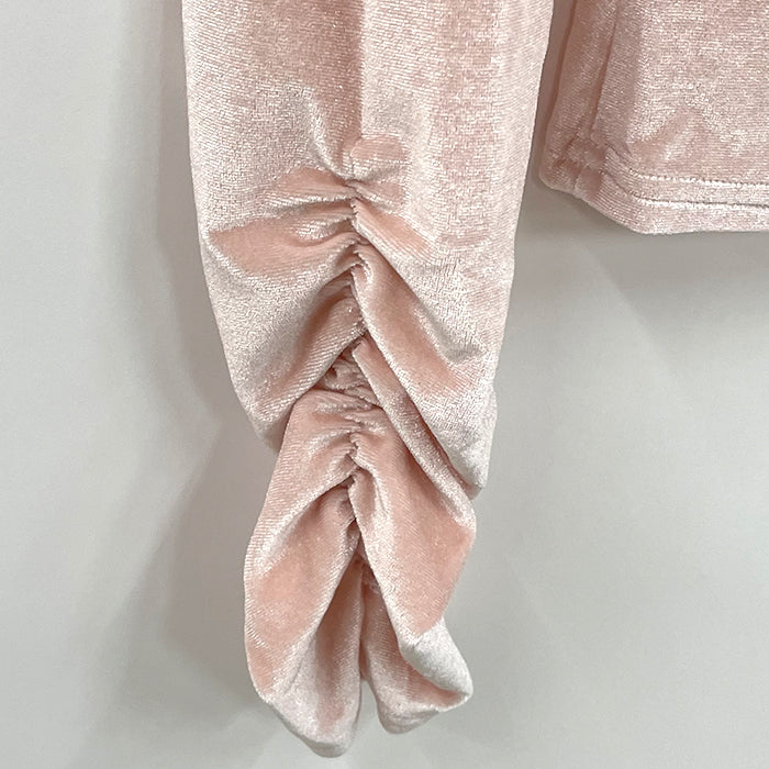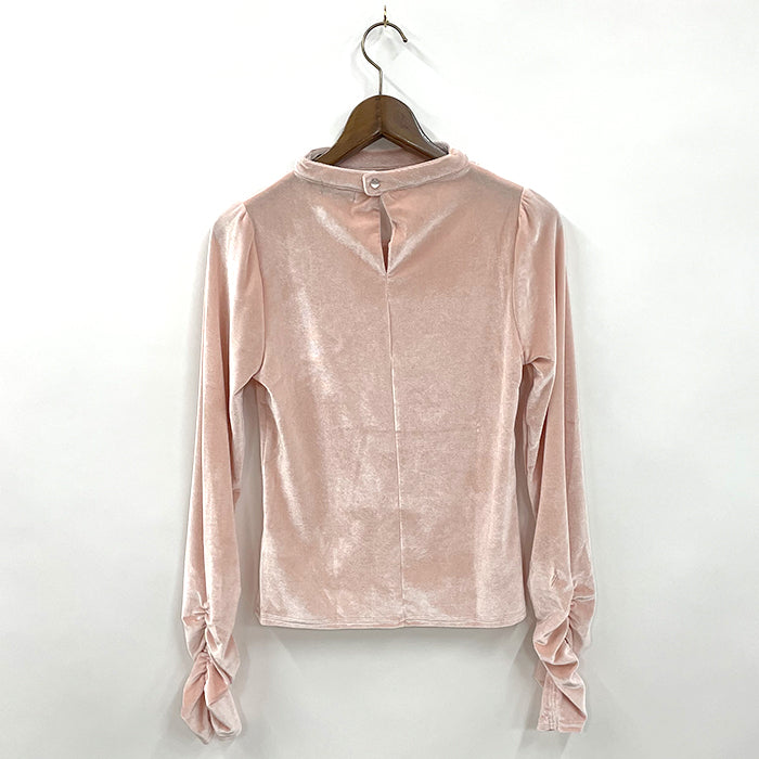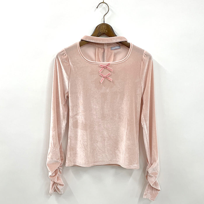 伸縮性のあるベロア素材で胸元にはベロアリボンがあしらわれています。チョーカー風デザインと袖口にはサムホール付きでトレンドライクな1着です。