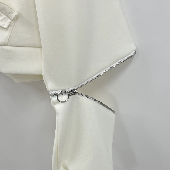 開けても閉めても着られるジップデザインがポイントのパーカーです。