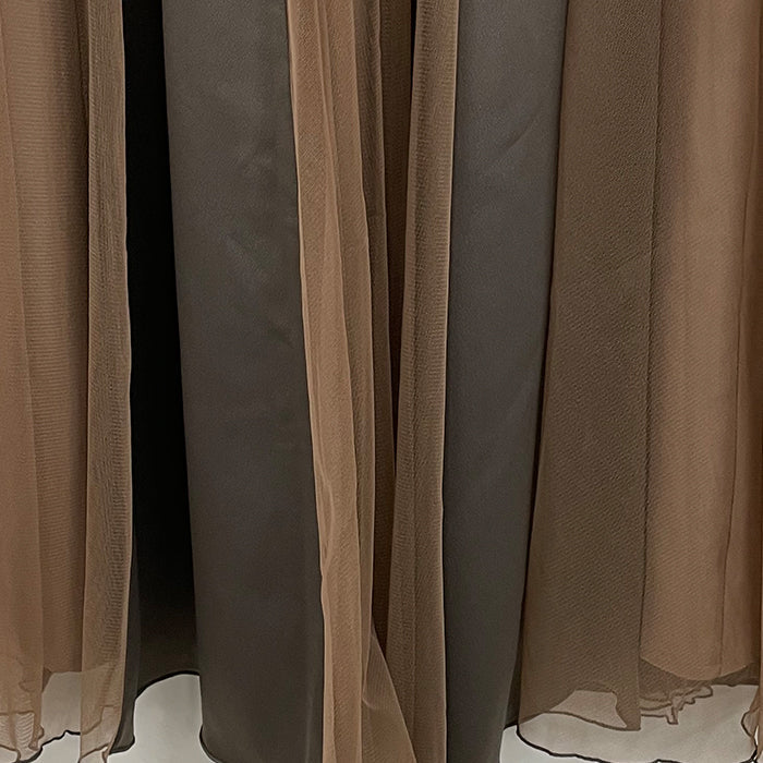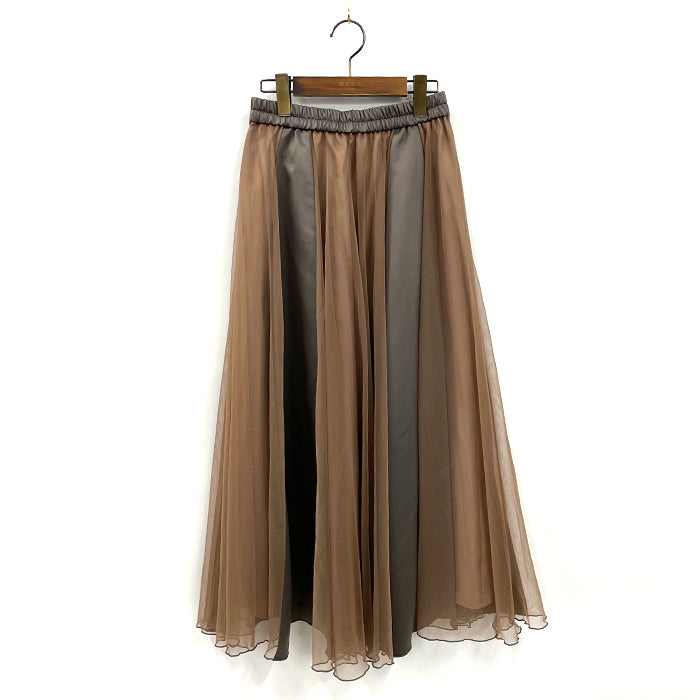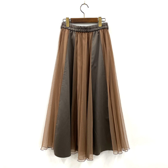 サテン生地とチュール生地を組み合わせたロングスカートです。広がりすぎないシルエットが美しいアイテム。人気のワインに加え秋らしいモカ、着回しやすいコンの3色でご用意しております。