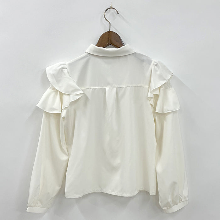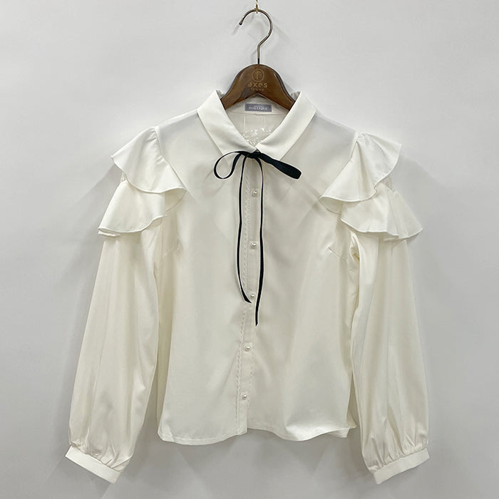 フリルたっぷりのブラウスはスッキリとしたボトムを合わせるのもおすすめです。