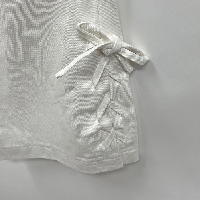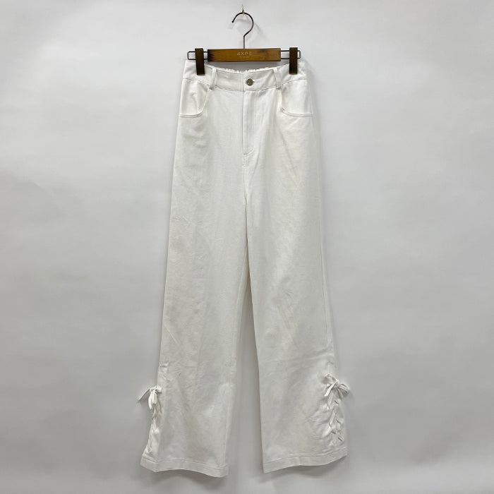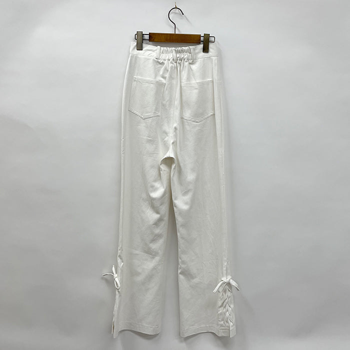 ハイウエストデザインで後ろ中心が一部ゴムになっており、伸縮性がある履きやすいパンツです。裾がレースアップデザインになっています。