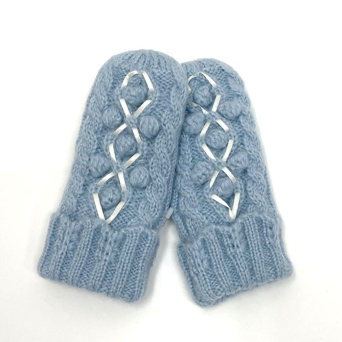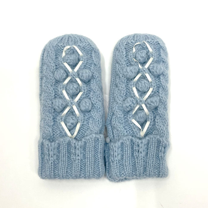親子や姉妹でリンクコーデを楽しめる!大人連動アイテム♪サテンリボンのレースアップがアクセントになったニットミトンです。