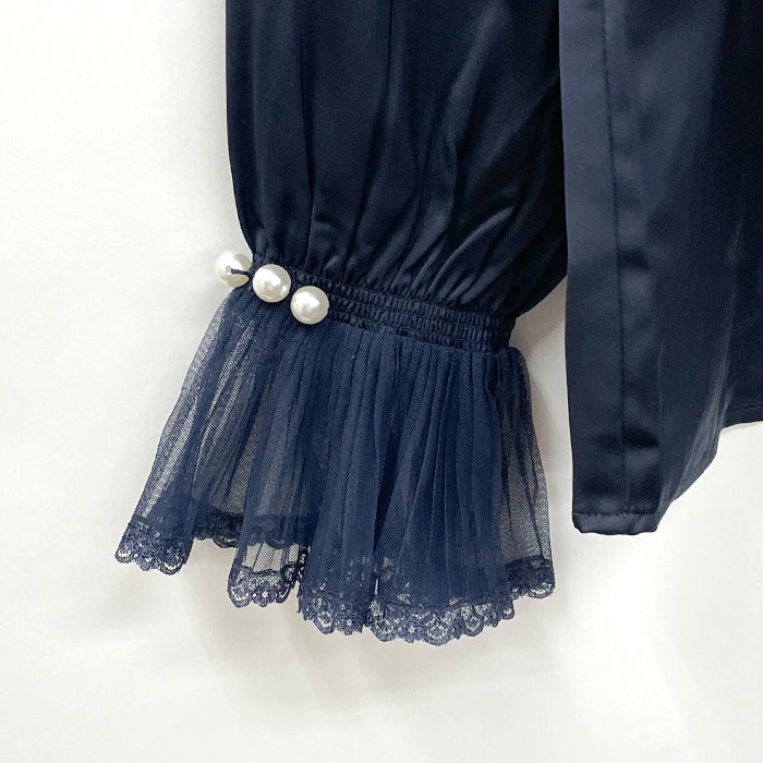 袖口には連なるパールとプリーツチュールでアクセントをプラス。