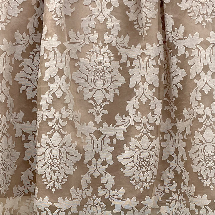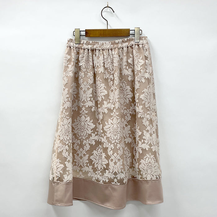 オーナメントモチーフがオーガンジーにプリントされたタックデザインスカート。ハリのある素材感で自然に広がるフレアラインがエレガンスなアイテム。オケージョンシーズンやオンスタイルにおすすめ。