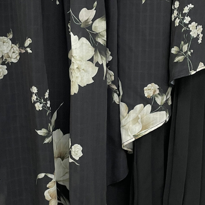 チェックのような表面感のある素材にエレガントな花柄をプリントしたスカートです。