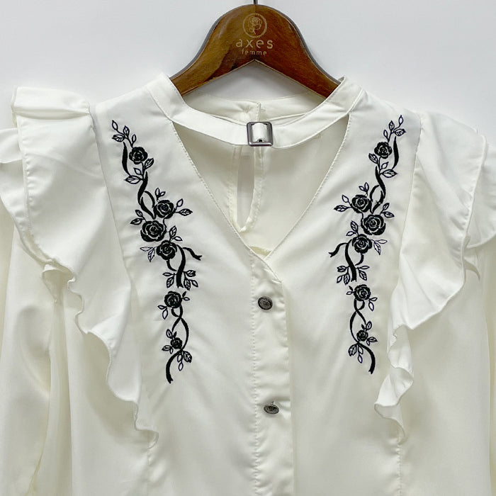 繊細なローズ刺繍がポイントのブラウスです。クラシカルなチョーカー風デザインとフロントの程よい肌みせが◎。